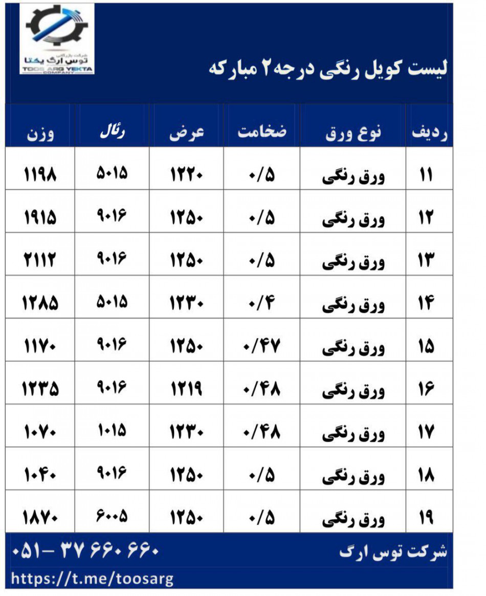 ورق آجدار : انبار تهران ۲ (۱*۲) ۳۵ کیلویی ۲/۵ (۱*۲) ۴۸ کیلویی ۳میل (۱*۲) ۴۹ کیلویی ۳میل (۱*٢) ٥٥ كيلويي ٣ميل (١/٢٥)(۱/۵) ۳/۵میل (۱/۲۵) ۳/۷میل (۱/۲۵) ٤ميل (١/٢٥)(١/٥)(١*٢) ۵میل (۱/۲۵۱/۵) ٨ميل (١/٥) ۱۰میل (۱/۵)(۵۱۸×۱۲۵) تلفن : ۰۲۱۳۳۵۳۱۴۲۴ تلفن همراه: ٠٩١٢٣٢٤١٧١٠