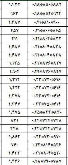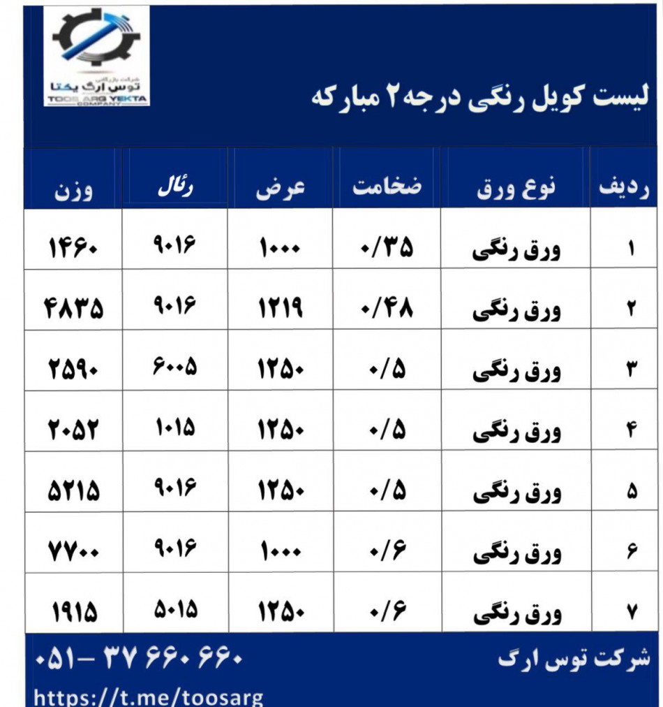 ورق گيلان انبار تهران ۳۰میل (ابعاد مختلف) ۴۰میل (ابعاد مختلف) ۱۲۰میل (۱۰۵*۹/۴۵) ۱۲۵میل(۱۰۵*۹/۱۰) ورق خرم اباد : تهران ۱۵میل (۶*۱۰۵) ۱۵میل (۶۳*۱۰۵) ۲۰میل (۶۴*۱۰۵) ۲۵میل (۶۴*۱۰۵) ورق فولاد مبارکه (ST37): انبار تهران فابریک ۵میل (۶*۱/۵) ۶میل (۶*۱/۵) ۸میل (۶*۱/۵) ۱۰میل (۶*۱/۵) ۱۲میل (۶*۱/۵) ۱۵میل (۶*۱/۵) ورق قطعات (ST37) : کارخانه ۱۰میل (عرض ۱۲۰) ۱۲میل (عرض۱۲۰) ۱۵میل (عرض۱۲۰) ۲۰میل (عرض۱۲۰)