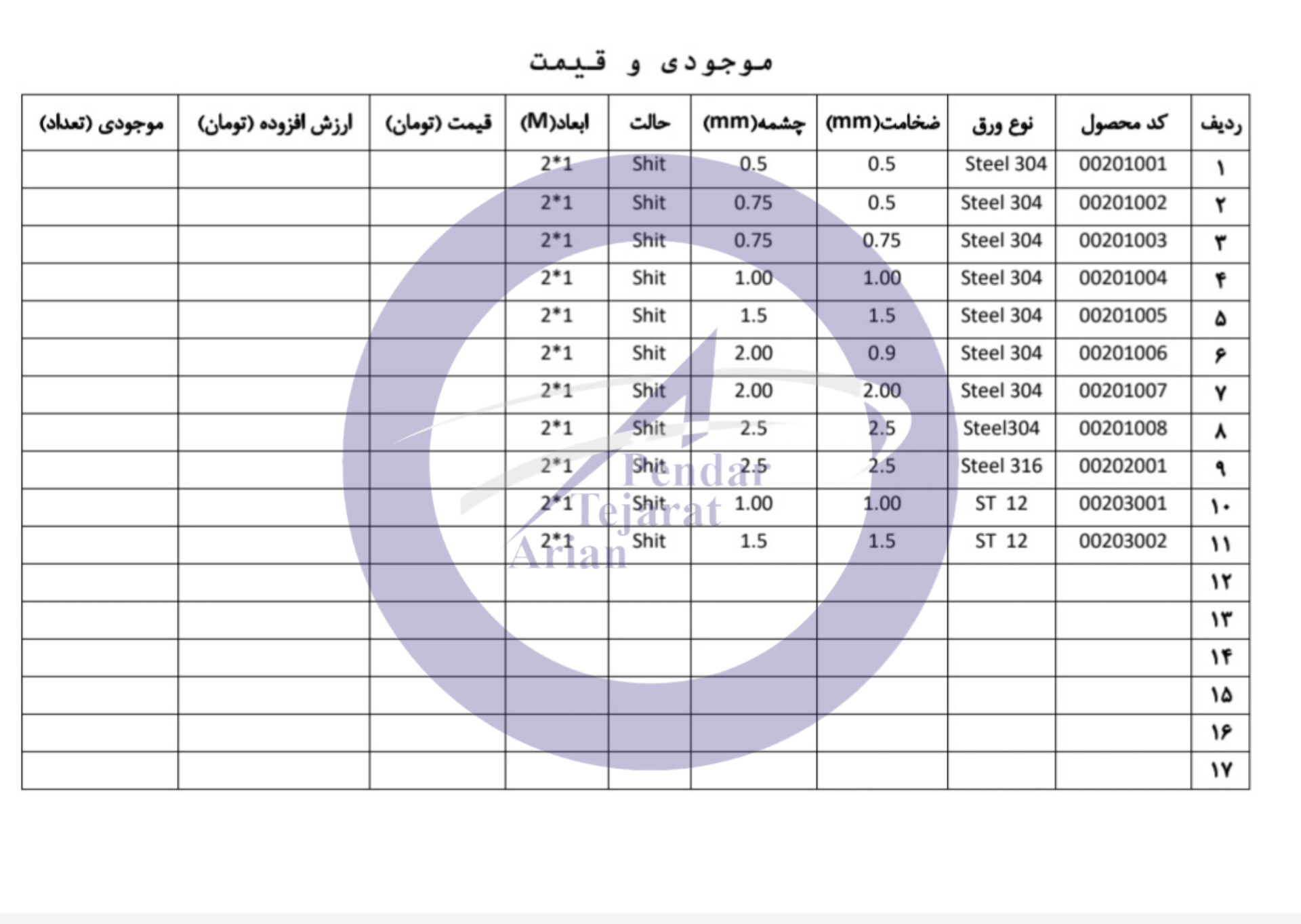 *بازرگانی پندار تجارت آرین**واردکننده کلیه ورقهای فولادی پانچ (به ویژه ورق استیل)*تولید و تامین انواع مش و توری و پانچ ضخیم بار با نازلترین قیمت آماده همکاری میباشد. آدرس دفتر مرکزی: استان البرز ، فردیس ، بهاران غربی ، پلاک ۵۶۳آدرس انبار : تهران ، شادآباد کارشناس فروش (قربانی) 📲 *02191693321* 📲 *09129400531* مدیریت (آقای مهربانی) 📲 *09121641596*