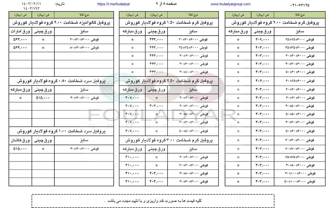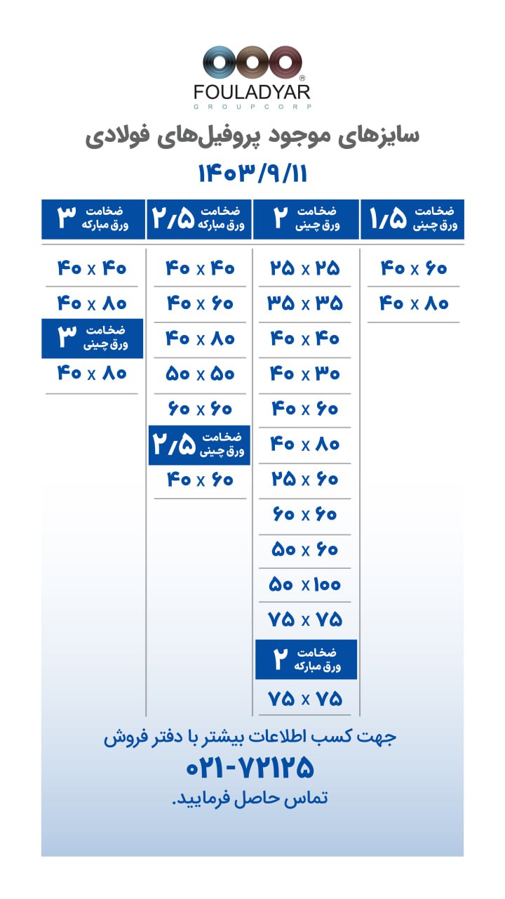 ⏺لیست سایزهای موجود پروفیل فولادیار کوروش در ضخامتهای ۱.۵ ، ۲ ، ۲.۵ و ۳ با ورق گرم فولاد مبارکه و ورق گرم چینی ⏺تلفن تماس برای ثبت سفارش: 02172125 کلیک کنید👈🏻 +982172125000