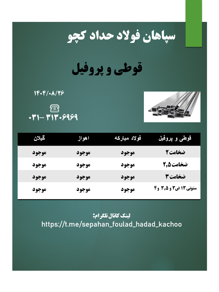 ✅سپاهان فولاد حداد کچو ⚡️موجودی قوطی وپروفیل ☑️ برای مشاوره و راهنمایی در مورد خرید لطفا با ما تماس بگیرید . ☎️ 31306969 031 ☎️ 09132366086 ☎️ 09130502151 لینک کانال تلگرام: https://t.me/sepahan_foulad_hadad_kachoo