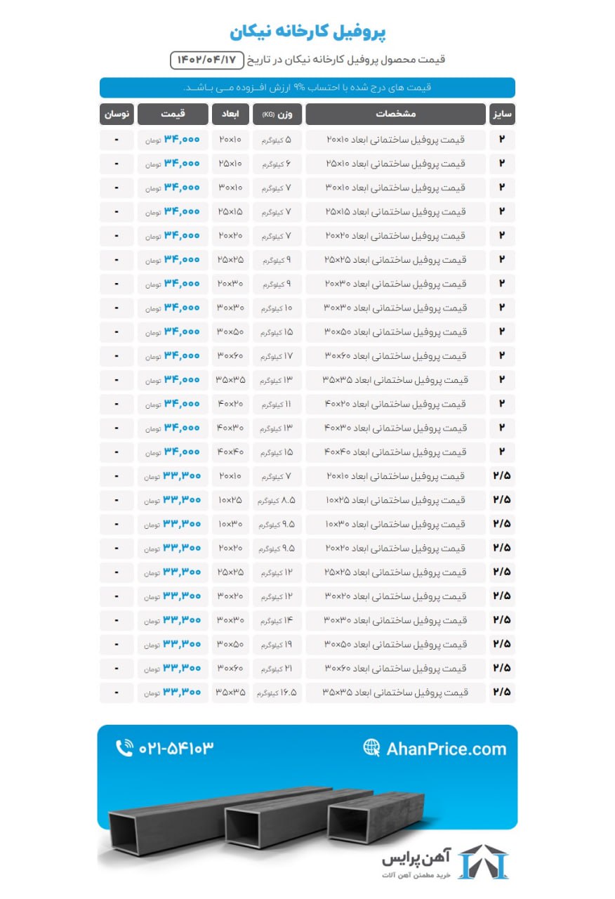 اعلام موجودی پروفیل افلاک اهن #لیست_قوطی_پروفیل_فولادی_و_اهوازیپروفیل ضخامت 2 فولادی ⬅️ 34700 تومان پروفیل ضخامت 2 اهوازی ⬅️ 34200 تومان پروفیل ضخامت 2/5 اهوازی ⬅️ 33400 تومان پروفیل ضخامت 3و4 اهوازی ⬅️ 33400 تومانستونی 3-4 میل ⬅️ 32300 تومان