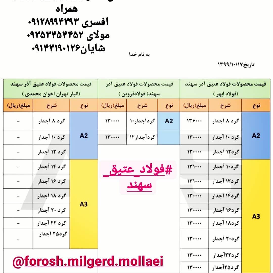 فولاد عتیق سهند تامین کننده ی انواع میلگرد موجودی میلگرد امروز را در فایل ارسالی مشاهده بفرمایید 09353454452 09128994393 09143190126