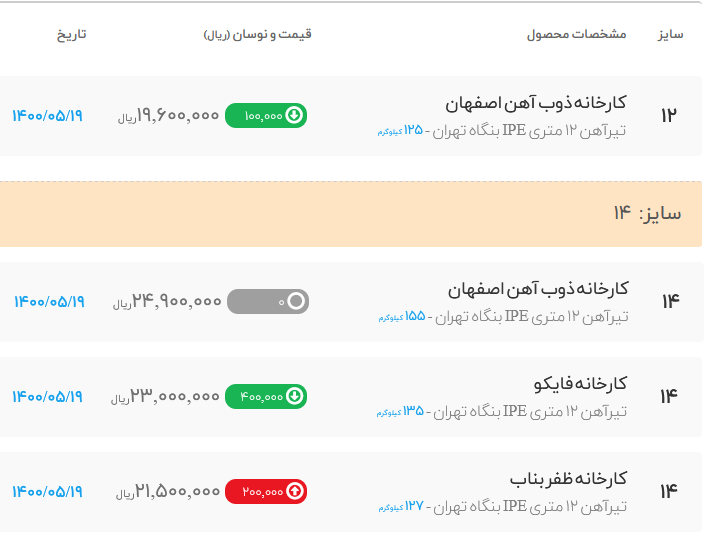📅 سه شنبه 19 مرداد ماه 1400 #تیرآهن_ذوب_آهن_شاخه @AhanShopp بارگیری انبار تهران ▫️نوسان 10000 تا 50000 تومان تیرآهن 12 ⬅️ تومان تیرآهن 14 ⬅️ 2268000تومان تیرآهن 16 ⬅️ 3296000تومان تیرآهن 18 ⬅️ 4085000تومان تیرآهن 20 ⬅️ 5012000تومان تیرآهن 22 ⬅️ 6443000تومان تیرآهن 24 ⬅️ 6828000تومان تیرآهن 27 ⬅️ 7819000تومان تیرآهن 30 ⬅️ 9654000تومان 📲 09125452304 ذوالفقاری