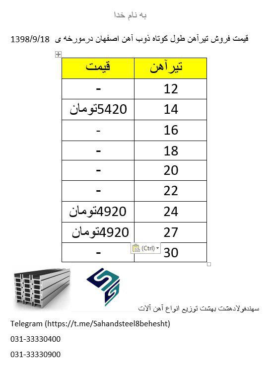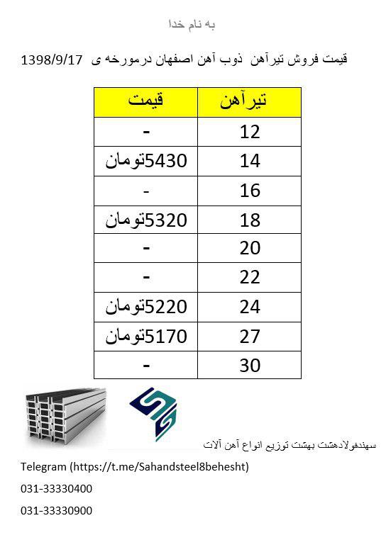 قیمت های فروش تیرآهن نرمال ذوب آهن اصفهان بشرح ذیل اعلام میگردد سایز 24 نرمال 4900 سایز 27 نرمال 4900 سهند فولاد هشت بهشت