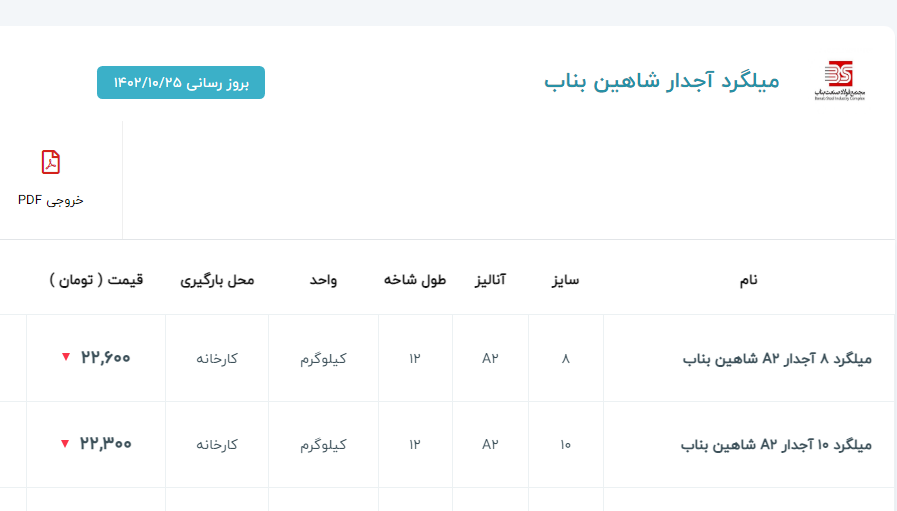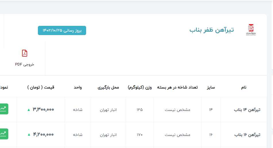 تیرآهن کیلویی ذوب_آهن_اصفهان انبار_ سایز۱۲: ۴۰۰.۰۰۰ریال سایز۱۴: ۲۷۵.۰۰۰ ریال سایز۱۶: ۲۷۳،۰۰۰ ریال سایز۱۸: ۲۷۳،۰۰۰ ریال سایز۲۰: ۳۱۰،۰۰۰ ریال سایز۲۲: ۳۱۰،۰۰۰ ریال سایز۲۴: ۳۰۰،۰۰۰ ریال سایز۲۷: ۲۹۵،۰۰۰ ریال سایز۳۰: ۳۳۰،۰۰۰ ریال