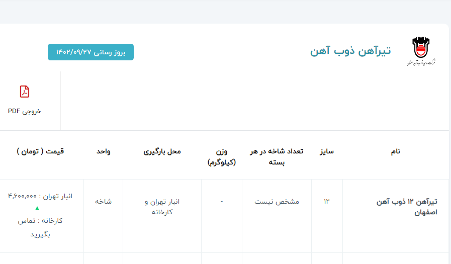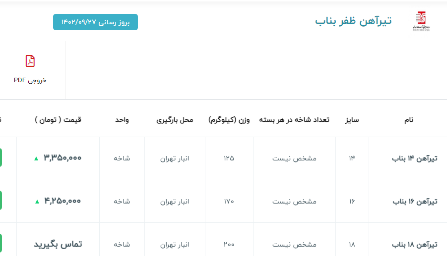 🌼🌼به نام خدا🌼🌼 1402/09/27 🔴لیست موجود درب مغازه 🟡تیرآهن اصفهان تيراهن 12 اصفهان (۱۳۰کیلو) 4750 تيراهن 14 اصفهان (۱۵۵کیلو) 4250 تيراهن 16 اصفهان (١٩٠کیلو) 5250 تيراهن 18 اصفهان (٢٣٠کیلو) 6250 تيراهن 20 اصفهان (۲۷۲كیلو) 7750 تيراهن 22 اصفهان (٣٢٠كیلو) 9550 تيراهن 24 اصفهان (٣٧٥كیلو) 10750 تيراهن 27 اصفهان (٤٤٠كیلو) 12100 تيراهن 30 اصفهان (٥١٠كیلو) 13950 🟡تیرآهن متفرقه تيراهن 14 ماهان (١۱۰كیلو) 3150 تيراهن 14 اهواز (١۳۱كیلو) 3350 تیراهن 16 اهواز (۱۶۸کیلو) 4250 تيراهن 18 فایکو (۲۰۸کیلو) 5500 تیراهن 20 فایکو (۲۵۱کیلو) —— تیراهن 22 یزدی (۳۰۰کیلو) 7750 تیراهن 24 یزدی (۳۵۰کیلو) 9000 تلفن: 66317671 آدرس مجموعه:تهران،بازار آهن شاد آباد مجتمع بهاران۲ بلوک ۳۳ پلاک ۱۰۰