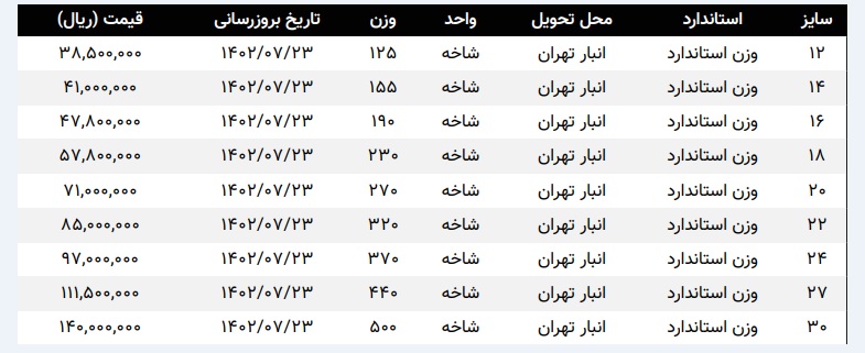 محصول قیمت (با مالیات) یکشنبه 1402807/22 ساعت 17 تیرآهن 12 ذوب آهن 12 متری انبار تهران 3,860,000 تیرآهن 14 ذوب آهن 12 متری انبار تهران 4,100,000 تیرآهن 16 ذوب آهن 12 متری انبار تهران 4,780,000 تیرآهن 18 ذوب آهن 12 متری انبار تهران 5,780,000 تیرآهن 20 ذوب آهن 12 متری انبار تهران 7,120,000 تیرآهن 22 ذوب آهن 12 متری انبار تهران 8,500,000 تیرآهن 24 ذوب آهن 12 متری انبار تهران 9,720,000 تیرآهن 27 ذوب آهن 12 متری انبار تهران 11,150,000 تیرآهن 30 ذوب آهن 12 متری انبار تهران 14,010,000 تیرآهن 12 ذوب آهن بنگاه اصفهان 4,000,000 تیرآهن 14 ذوب آهن بنگاه اصفهان 4,100,000 تیرآهن 16 ذوب آهن بنگاه اصفهان 4,740,000 تیرآهن 18 ذوب آهن بنگاه اصفهان 5,760,000 تیرآهن 20 ذوب آهن بنگاه اصفهان 7,060,000 تیرآهن 22 ذوب آهن بنگاه اصفهان 8,500,000 تیرآهن 24 ذوب آهن بنگاه اصفهان 9,500,000 تیرآهن 27 ذوب آهن بنگاه اصفهان 11,110,000 تیرآهن 30 ذوب آهن بنگاه اصفهان 13,810,000 تیرآهن 12 ذوب آهن کارخانه 31,010 تیرآهن 14 ذوب آهن کارخانه 26,700 تیرآهن 16 ذوب آهن کارخانه 25,000 تیرآهن 18 ذوب آهن کارخانه 25,000 تیرآهن 20 ذوب آهن کارخانه 26,210 تیرآهن 22 ذوب آهن کارخانه 27,010 تیرآهن 24 ذوب آهن کارخانه 25,800 تیرآهن 27 ذوب آهن کارخانه 25,500 تیرآهن 30 ذوب آهن کارخانه 27,800 📡 راه های ارتباطی در دیجی اهن: ☎️ شماره تماس: شماره چهار رقمی تهران 1849 شهرستانها 02186020094 instagram.com/digi.ahan :اینستاگرام🆔 🌐وبسایت: www.digiahan.com ✅تلگرام: https://t.me/Digiahan1849