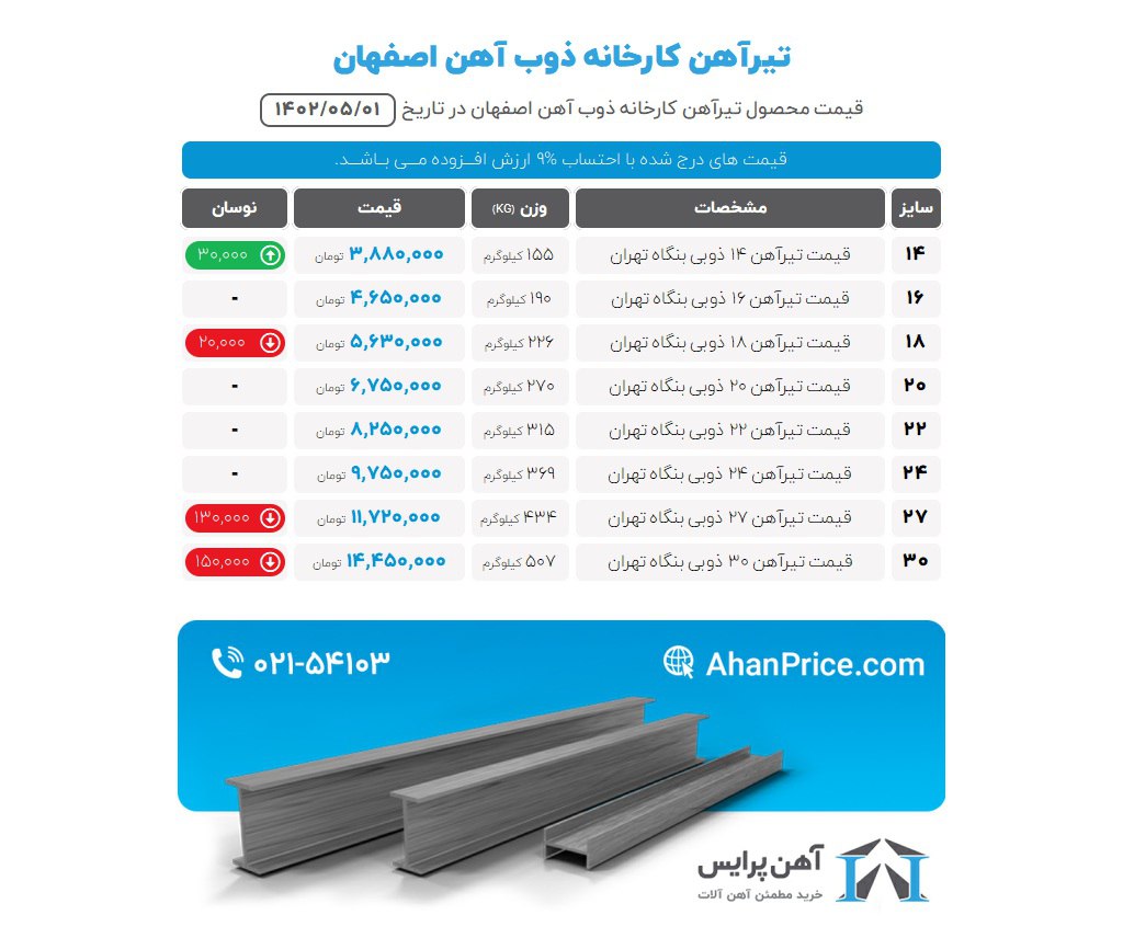 اعلام موجودی تیراهن آراد فولاد اذربایجان(انبار تهران)🔸تیرآهن سایز۱۲: ۳۲.۰۰۰.۰۰۰ ریال 🔸تیرآهن سایز۱۴: ۳۸.۷۰۰.۰۰۰ ریال 🔸تیرآهن سایز۱۶: ۴۶.۰۰۰.۰۰۰ ریال 🔸تیرآهن سایز۱۸: ۵۶.۰۰۰.۰۰۰ ریال 🔸تیرآهن سایز۲۰: ۶۷.۰۰۰.۰۰۰ ریال 🔸تیرآهن سایز۲۲: ۸۲.۰۰۰.۰۰۰ ریال 🔸تیرآهن سایز۲۴: ۹۷.۰۰۰.۰۰۰ ریال 🔸تیرآهن سایز۲۷: ۱۱۷.۰۰۰،۰۰۰ ریال 🔸تیرآهن سایز۳۰: ۱۴۵.۰۰۰.۰۰۰ریال