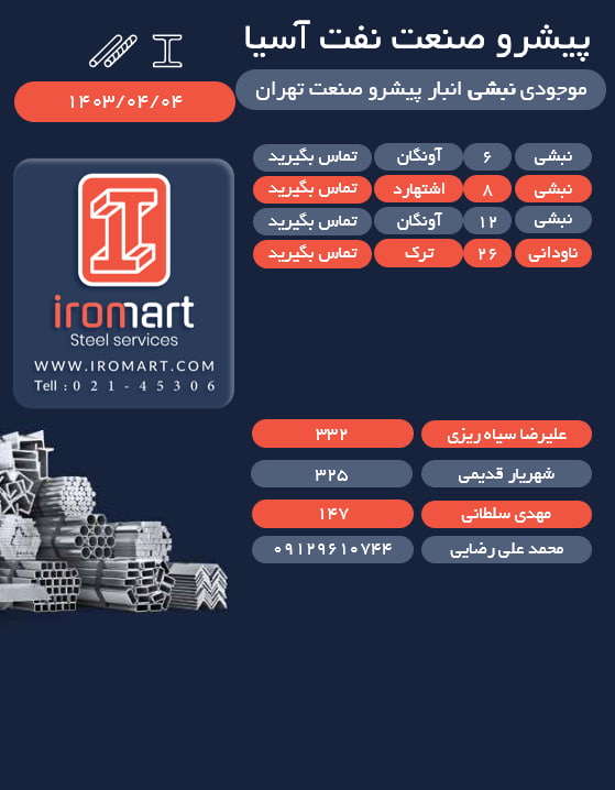 🟠 شرکت #پارس_مواد_نقش_جهان میلگرد _ آرمان آسیا 🔸میلگرد A2 سایز 10 277,000 ریال 🔸میلگرد A3 سایز 16 268,000 ریال 🔸میلگرد A3 سایز 18 268,000 ریال ——————————————- خاموت 🔹خاموت فابریک ۱۰ و ۱۲ سنجاقی و مهندسی 700+ 307,000 ریال ——————————————- تیرآهن _ ذوب آهن 🔹تیرآهن سایز ۱۲ 302,000 ریال 🔹تیرآهن سایز ۱۴ 292,000 ریال 🔹تیرآهن سایز ۱۶ 292,000 ریال 🔹تیرآهن سایز ۱۸ 292,000 ریال 🔹تیرآهن سایز ۲۰ 312,000 ریال 🔹تیرآهن سایز ۲۲ 297,000 ریال 🔹تیرآهن سایز ۲۴ 283,000 ریال 🔹تیرآهن سایز ۲۷ 283,000 ریال 🔹تیرآهن سایز ۳۰ 307,000 ریال —————————————- میلگرد _ آرین فولاد 🔹میلگرد A2 سایز 10 281,000 ریال 🔹میلگرد A2 سایز 12 🔹میلگرد A3 سایز 10 282,000 ریال 🔹میلگرد A3 سایز 12 281,000 ریال 🔹میلگرد A3 سایز 14 تا 25 277,000 ریال —————————————— نبشی _ آرین فولاد 🔹نبشی 4 گ 3 289,000 ریال 🔹نبشی 4 گ 4 280,500 ریا 🔹نبشی 7 287,500 ریال 🔹نبشی 5 -6 279,500 ریال 🔹نبشی 10 286,500 ریال 🔹نبشی 12 286,500 ریال —————————————- #جهت_مشاهده_پروفایل_پارس_مواد_نقش_جهان https://foolad24.com/profile/17737 #جهت_مشاهده_اعلام_موجودی_پارس_مواد_نقش_جهان https://foolad24.com/profile/17737/inventory 📌 تامین کننده انواع مقاطع فولادی( میلگرد، نبشی، تیرآهن، ناودانی، لوله، ورق و ...) 📎 اطلاعات تماس: 📞 031-35058 🌐 parsferro.com ✉️ info@parsferro.com 🆔 @parsferro 🧭 اصفهان، خیابان مصلی شمالی(آب ۲۵۰)، ساختمان هدی، طبقه دوم، واحد ۸