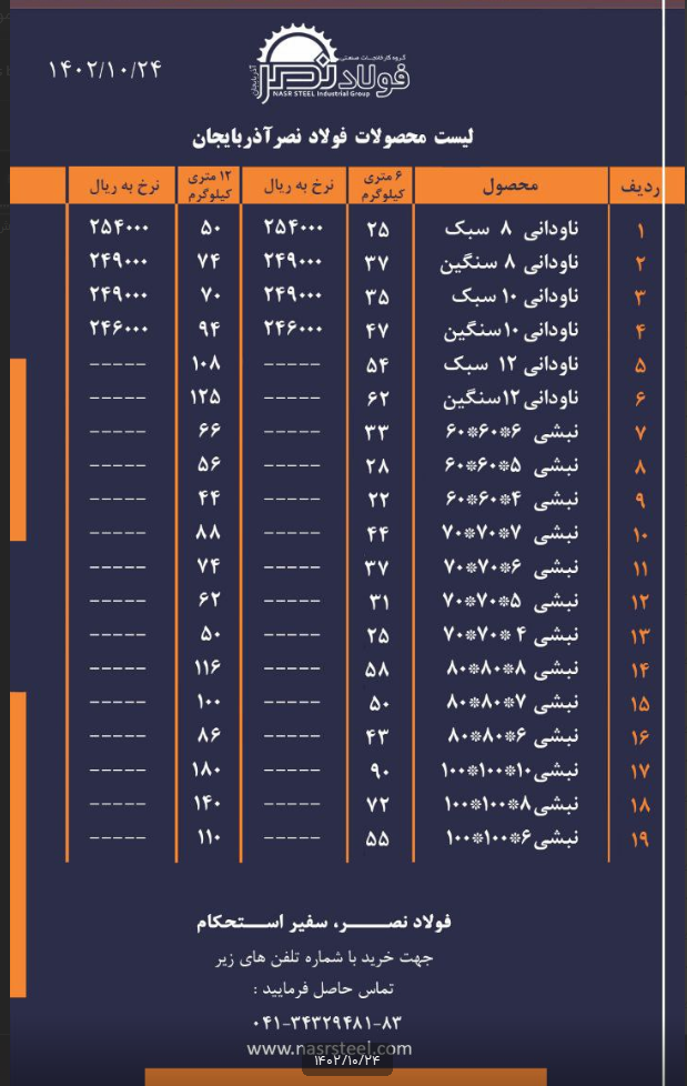 💠 گروه کارخانجات #فولاد_نصر_آذربایجان 📌تولید کننده انواع ناودانی ، نبشی و تیرآهن با استاندارد های روز دنیا 📌صادر کننده نمونه استانی #جهت_مشاهده_پروفایل_فولاد_نصر_آذربایجان👇🏻 📌https://foolad24.com/profile/12247 #جهت_مشاهده_اعلام_موجودی_فولاد_نصر_آذربایجان https://foolad24.com/profile/12247/inventory 📍آدرس کارخانه : تبریز ، جاده آذرشهر ، شهرک صنعتی سلیمی 📌تلفن های دپارتمان فروش: ☎️04134329481 ☎️04134329482 ☎️04134329483 📱09129308689 📱09144199362 🆔https://t.me/NasrsteelAZ 📌https://www.instagram.com/nasrsteel 🌐nasrsteel.com