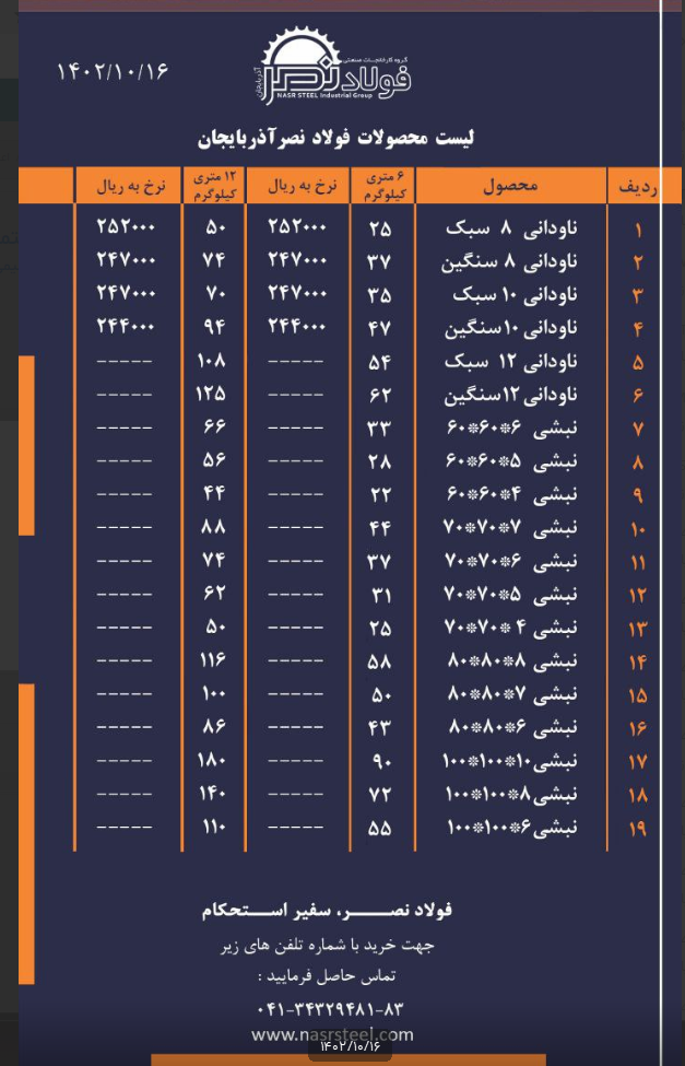 💠 گروه کارخانجات #فولاد_نصر_آذربایجان 📌تولید کننده انواع ناودانی ، نبشی و تیرآهن با استاندارد های روز دنیا 📌صادر کننده نمونه استانی #جهت_مشاهده_پروفایل_فولاد_نصر_آذربایجان👇🏻 📌https://foolad24.com/profile/12247 #جهت_مشاهده_اعلام_موجودی_فولاد_نصر_آذربایجان https://foolad24.com/profile/12247/inventory 📍آدرس کارخانه : تبریز ، جاده آذرشهر ، شهرک صنعتی سلیمی 📌تلفن های دپارتمان فروش: ☎️04134329481 ☎️04134329482 ☎️04134329483 📱09129308689 📱09144199362 🆔https://t.me/NasrsteelAZ 📌https://www.instagram.com/nasrsteel 🌐nasrsteel.com