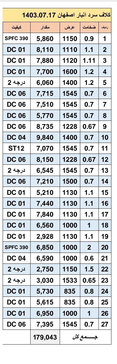 موجودی ورق گالوانیزه موجود در انبار زرین فولاد شهریاری ✅ورق گالوانیزه تاراز 🔹0/40 میل، عرض 1000 🔸0/40 میل، عرض 1250 🔹0/50 میل، عرض 1000 🔸0/50 میل، عرض 1250 🔹0/55 میل، عرض 1250 🔸0/60 میل، عرض 1000 🔹0/60 میل، عرض 1250 🔸0/70 میل، عرض 1000 🔹0/70 میل، عرض 1250 🔸0/80 میل، عرض 1000 🔹0/80 میل، عرض 1250 🔸0/90 میل، عرض 1000 🔹0/90 میل، عرض 1250 🔸1 میل، عرض 1000 🔹1 میل، عرض 1250 🔸1/25 میل، عرض 1000 🔹1/25 میل، عرض 1250 🔸1/5 میل، عرض 1000 🔹1/5 میل، عرض 1250 🔸1/8 میل، عرض 1000 🔹1/8 میل، عرض 1250 🔸2 میل، عرض 1000 🔹2 میل، عرض 1250 ✅ورق گالوانیزه فولاد دشتستان 🔹0/70 میل،عرض 1250 🔸0/80 میل،عرض 1250 🔸1 میل،عرض 1250 ✅ورق گالوانیزه کاشان 🔹0/50 میل،عرض 1250 🔸0/50 میل،عرض 1000 🔹0/60 میل،عرض 1250 🔸0/60 میل،عرض 1000 🔹0/70 میل،عرض 1000 🔸1/5 میل،عرض 1000