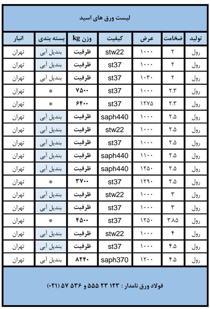 #آکام_فولاد_پرگاس 💠تامین کننده اصلی ورق های فولاد اکسین 💠عرضه ورق های کاویان ، مبارکه ، استیل و وارداتی 🎲تامین کننده ی ورق استیل 2B) 304) ضخامتهای : 🎲 0/8 میلیمتر عرض یک متر 🎲 1 میلیمتر عرض یک متر موجودی جهت فروش ورق استیل تیسکو چین گرید 304L 2B ضخامت ۱ عرض ۱ ضخامت ۲ عرض ۱،۵ ضخامت ۳ عرض ۱،۵ ضخامت ۴ عرض ۱،۵ فروش به صورت رول ☸️موجودی ورق های فولاد اکسین A283-ST37-ST52 10*2*6➖12 12*2*6➖12 15*2*6➖12 20*2*6➖12 25*2*6➖12 30*2*6➖12 35*2*6➖12 40*2*6➖12 50*2*---- #جهت_مشاهده_پروفایل_آکام_فولاد_پرگاس👇 🪐https://foolad24.com/profile/13927 #جهت_مشاهده_اعلام_موجودی_آکام_فولاد_پرگاس👇 🪐https://foolad24.com/profile/13927/inventory ☎️02122748441 ☎️02122748442 📲09122382519 🪐Akamfoulad.com