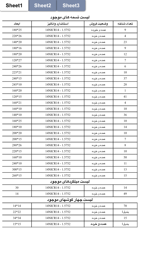 توسعه صنعت فولاد مهندسان آذربايجان لیست چهار گوشهای موجود ابعاد آنالیزو استاندارد فروش تعداد_ شاخه 14*14 14NICR14 1.5752 عمده و خرده 70 22*22 14NICR14 1.5752 عمده و خرده 1بندیل 34*34 14NICR14 1.5752 عمده و خرده 15 15*15 14NICR14 1.5752 عمده و خرده 1بندیل