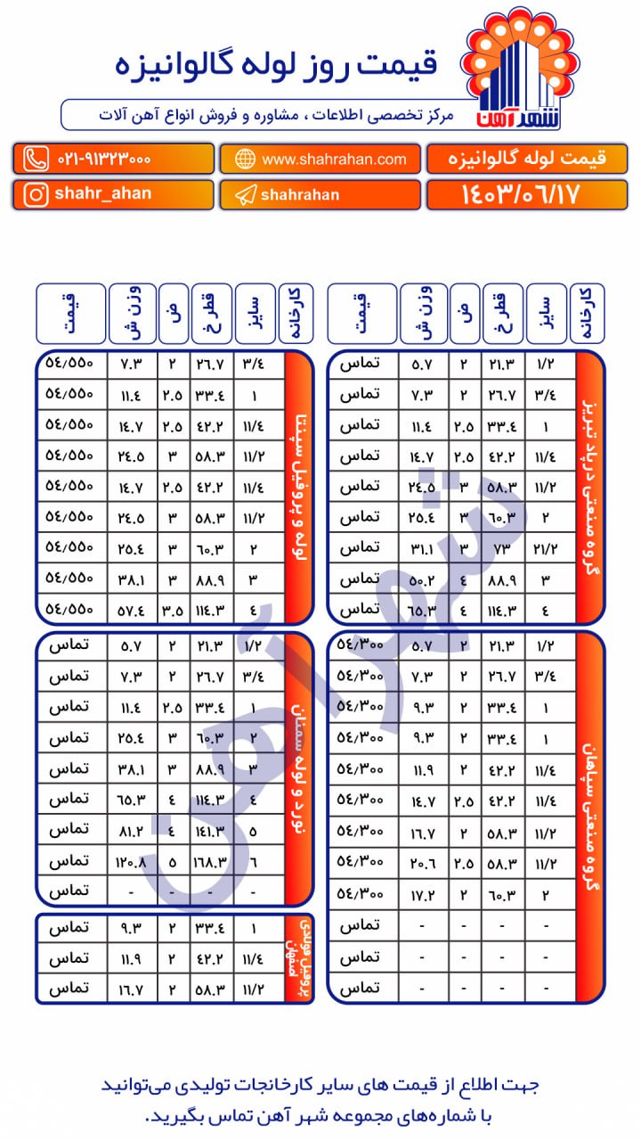 قیمت لوله گالوانیزه 🗓 17 #شهریور 1403 #لوله #گالوانیزه #لوله_گالوانیزه 📞شماره تماس با مجموعه 👇 02191323000 🔸مشاهده قیمت به روز کلیه کارخانجات 👇 www.shahrahan.com 📣کانال تلگرام 👇 https://t.me/shahrahan 🌍آدرس مجموعه شهرآهن 👇 https://goo.gl/maps/JQsgAUrmvw8Bomy26