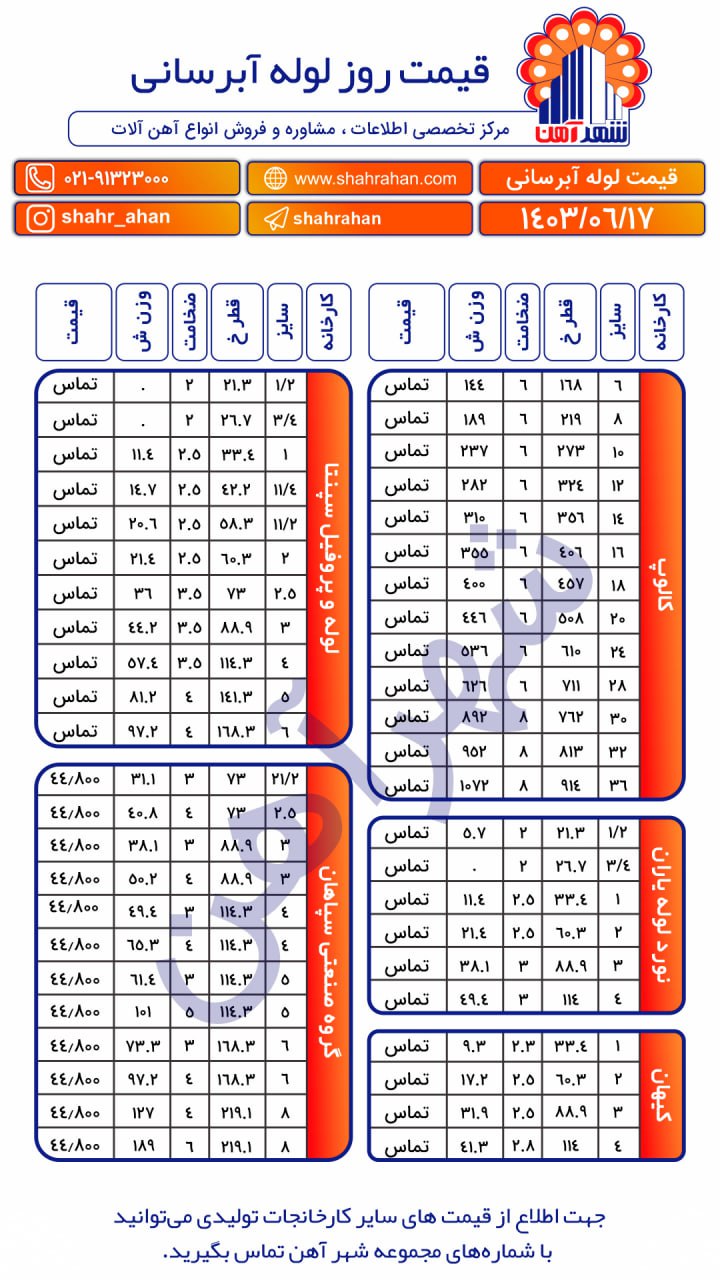 قیمت لوله آبرسانی 🗓 17 #شهریور 1403 #لوله #آبرسانی #لوله_آبرسانی 📞شماره تماس با مجموعه 👇 02191323000 🔸مشاهده قیمت به روز کلیه کارخانجات 👇 www.shahrahan.com 📣کانال تلگرام 👇 https://t.me/shahrahan 🌍آدرس مجموعه شهرآهن 👇 https://goo.gl/maps/JQsgAUrmvw8Bomy26