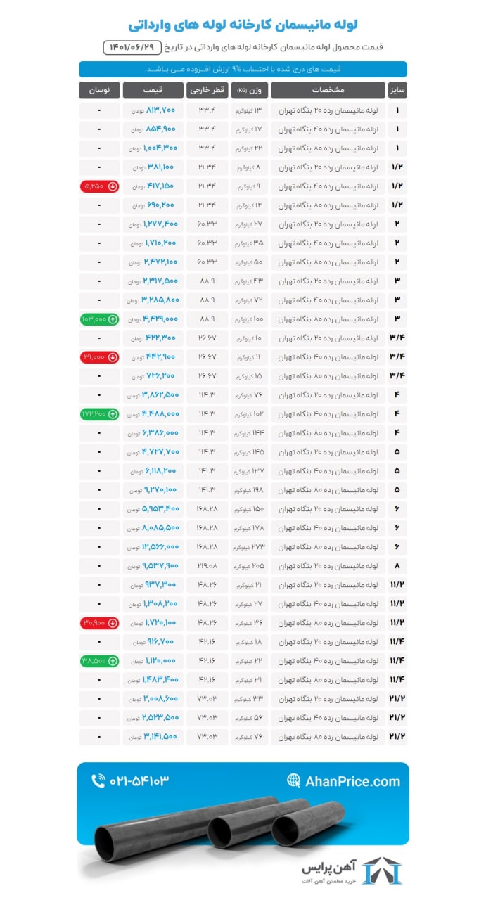 لیست #لوله_کالوپ لوله 6 اینچ ضخامت 6 ⬅️25600 تومان لوله 8 اینچ ضخامت 6 ⬅️25600 تومان لوله 10اینچ ضخامت 6⬅️25600 تومان لوله 12اینچ ضخامت 6⬅️25500 تومان لوله 12اینچ ضخامت 8⬅️25600 تومان لوله12اینچ ضخامت10⬅️25700 تومان لوله 14اینچ ضخامت 6⬅️25500 تومان لوله 14اینچ ضخامت 8⬅️25600 تومان لوله 14اینچ ضخامت 1⬅️25700 تومان لوله اسپیرال⬅️25600 تومان #لیست_کچو لوله گاز روکار خانگی("۳/۴و "۱/۲) ضخامت ۲/۳۵⬅️۲۳۴۰۰ تومان لوله گاز روکار خانگی("۱/۴-۱ و" ۱) ضخامت ۲/۸⬅️۲۳۴۰۰ تومان لوله گاز روکار خانگی("۳/۴و "۱/۲) ضخامت ۲/۵⬅️۲۲۹۰۰ تومان لوله گاز روکار خانگی("۱تا "۴) ضخامت ۳تا۴⬅️۲۲۹۰۰ تومان لوله تست شده("۴تا" ۱/۲_۲) ضخامت ۳ تا ۳/۵⬅️۲۱۵۰۰ تومان لیست قیمت محصولات #گروه_صنعتی_سپاهان لوله گاز روکار: 1/2" تا "2 ضخامت 2/5 تا 3 ⬅️ 25530 تومان لوله مانیس گاز API: 1/2" تا "4 ضخامت 2.8 تا 4.4⬅️ 26600 تومان لوله تست: 1/2 و 3/4 ضخامت 2/3 ⬅️ 24570 تومان "1 تا "2 ضخامت 2/8 ⬅️24570 تومان 1/2 2 تا "8 ضخامت 2/5 تا 4⬅️23500 تومان 1/2 2 تا "8 ضخامت 5 تا 6 ⬅️23500 تومان لوله صنعتی : 1/2 تا "8 ضخامت 2/5 تا 4 ⬅️22220 تومان 1/2 2 تا "8 ضخامت 5 تا 6 ⬅️ 22220 تومان لوله آبرسانی: "4 تا "8 ضخامت 4.4 تا 4.8⬅️ 23740 تومان لوله حاصل از گاز: "1/2 تا "2 ضخامت 2/5 تا 3/6⬅️ 22230 تومان