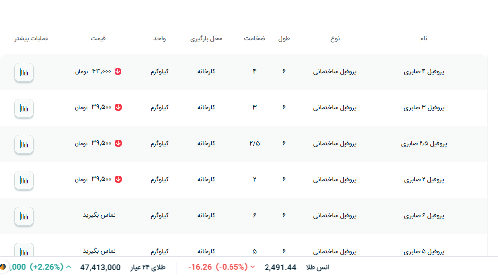 #محصولات_کیان_پرشیا پروفیل ضخامت ۱.۸ فولاد مبارکه ⬅️ 40500 تومان پروفیل ضخامت ۲ فولاد مبارکه ⬅️ 39500 تومان پروفیل ضخامت ۲.۵ و ۳ مبارکه ⬅️ 38500 تومان پروفیل ضخامت ۲ گیلانی ⬅️ 38500 تومان ورق ضخامت ۲ فولاد مبارکه ⬅️ 39500 تومان #لوله صنعتی قطر ۱.۲ و ۳.۴ ⬅️ 39800 تومان #لوله صنعتی سایر قطرها ⬅️ 38500 تومان قیمتها با ۱۰٪ مالیات و ارزش افزوده میباشد✔️ 📞031-45400945 📞031-91013608 📲09131273851 آقای مولوی 📲09137412265 خانم صحراکار 📲09137412146 آقای کریمیان www.aflakahan.com https://t.me/Ahanmoolaviali #اعتماد_شما_آغاز_تعهد_ماست🤝