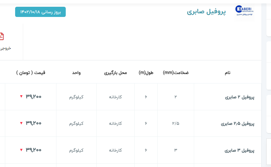 💢پروفیل (ورق فولاد مبارکه) ضخامت 2 ⬅️ 38.800 تومان ضخامت 2.5 ⬅️ 38.000 تومان ضخامت 3 ⬅️ 39.500 تومان ضخامت 4 ⬅️ 38.400 تومان ضخامت 5 ⬅️ 42.000 تومان ضخامت 6 ⬅️ 42.000 تومان 💢پروفیل (ورق اهواز _ گیلان) ضخامت 2 ⬅️ 37.800 تومان ضخامت 2.5 تا 4 ⬅️ 37.300 تومان 🚚بارگیری از کارخانه 🏗️شرکت فولاد سعادت پاسارگاد 09136021271 ☎️ 031_35493211