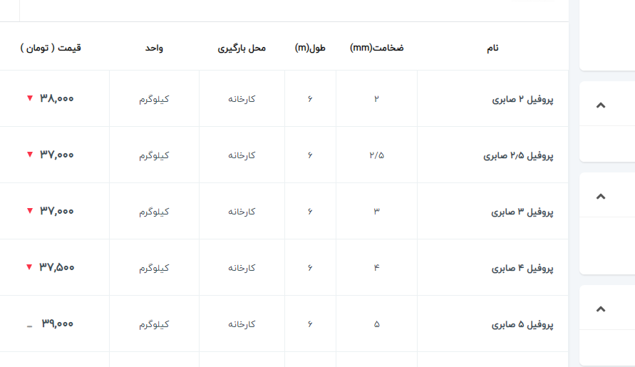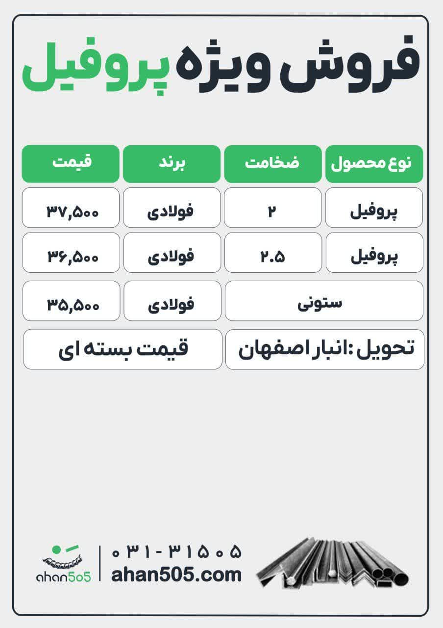 شرکت فیدار مبین آژند (آهن 505) *** فروش ویژه پروفیل *** ضخامت 2فولادی (تمامی سایزها) 37500ت ضخامت 2.5 فولادی(تمامی سایزها) 36500ت ستونی 35500 کارشناس فروش : آقای بیگدلی 09133241453 031-91088905 داخلی 105