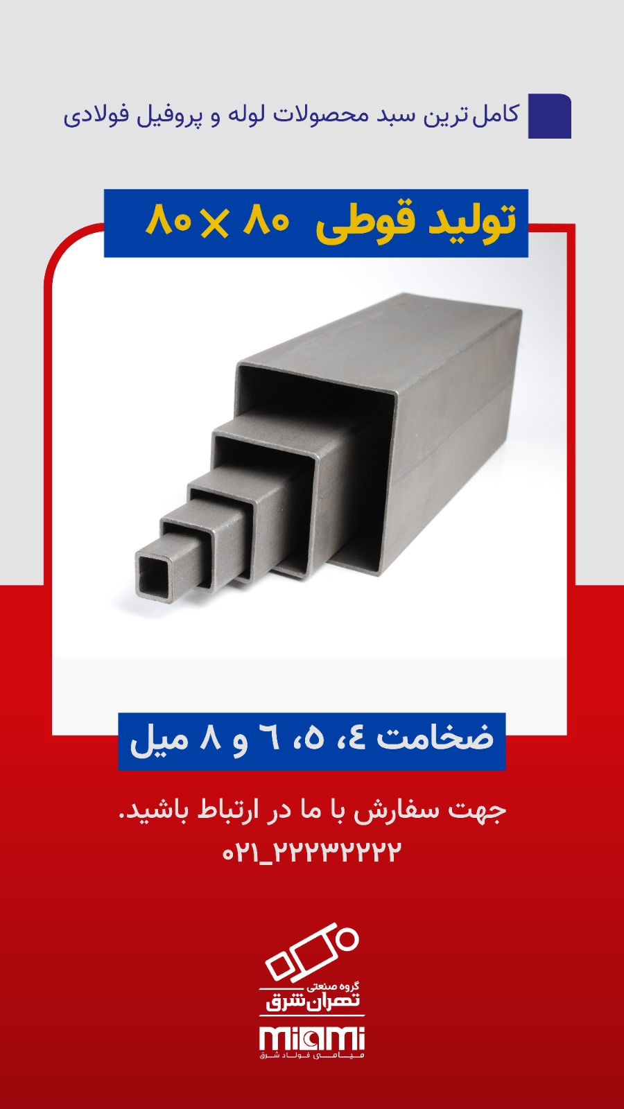 قوطی 80×80 از ورق مبارکه به ضخامت 3 میل 4 میل 5 میل 6 میل 6متری صنعتی آماده فروش میباشد. *جهت سفارش با ما درتماس باشید* کارشناس فروش خانم بابائی 09102014403