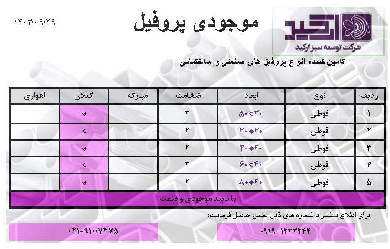 شرکت توسعه سبز ارکید 📌برای اطلاع از قیمت ها با این شماره های زیر تماس حاصل فرمایید: ☎️02144040701 02144018802 02144033515 02144976198 📱09191232244 09191232255 09191232266 ⭕️ عضویت در کانال پروفیل بر روری لینک زیر کلیک کنید: https://t.me/orchidgr ⭕️جهت مشاهده قیمت و موجودی ورق روی لینک زیر کلیک کنید: https://t.me/orchidgr2