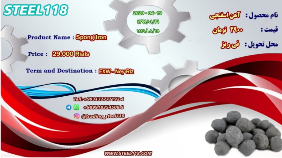 STEEL118 شرکت کوثر فولاد میهن تهیه تامین صادرات و واردات مواد اولیه و محصولات فولادی ۱۳۹۹/۰۱/۳۱ 20200419 1441/08/25 آهن اسفنجی قیمت : ۹+۲۹۰۰ تومان تحویل : نی ریز تماس: 03137777192 03137777193 03137777194 03137777189 واتس اپ تلگرام : 09918354508 09918354509 TELEGRAM http://tlgrm.in/steel118 INSTAGRAM http://instagram.com/_u/trading_steel118 www.STEEL118.COM