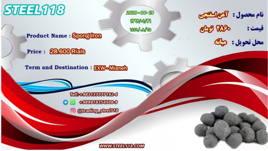 STEEL118 شرکت کوثر فولاد میهن تهیه تامین صادرات و واردات مواد اولیه و محصولات فولادی ۱۳۹۹/۰۱/۳۱ 20200419 1441/08/25 آهن اسفنجی قیمت : ۹+۲۸۶۰ تومان تحویل : میانه تماس: 03137777192 03137777193 03137777194 03137777189 واتس اپ تلگرام : 09918354508 09918354509 TELEGRAM http://tlgrm.in/steel118 INSTAGRAM http://instagram.com/_u/trading_steel118 www.STEEL118.COM