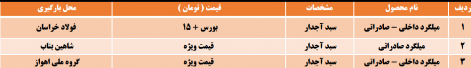 سه شنبه 98/09/05 عرضه محصولات فولادی شرکت کوثر فولادمیهن میلگردآجدار نیشابور داخلی صادراتی : بورس+۱۵ تومان میلگرد آجدار شاهین بناب صادراتی : قیمت ویژه میلگردآجدار گروه ملی اهواز صادراتی داخلی : قیمت ویژه