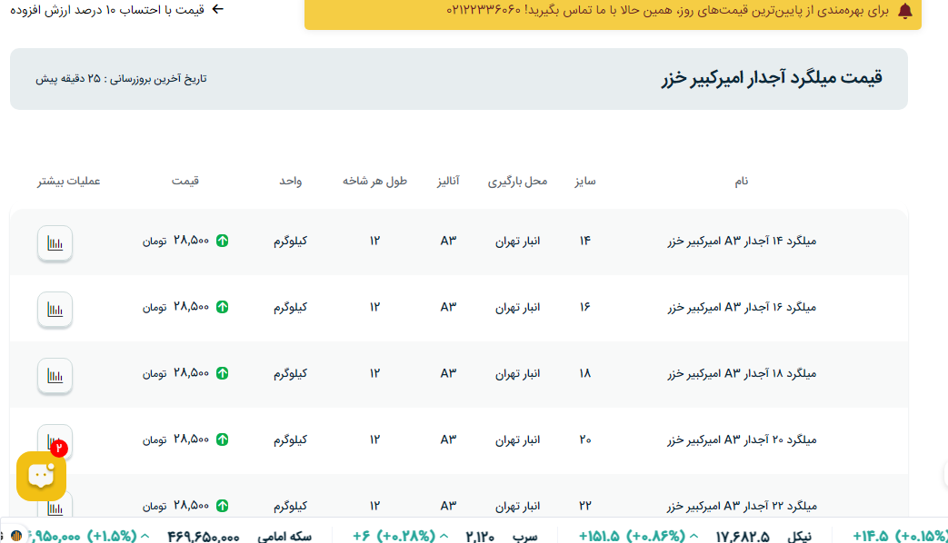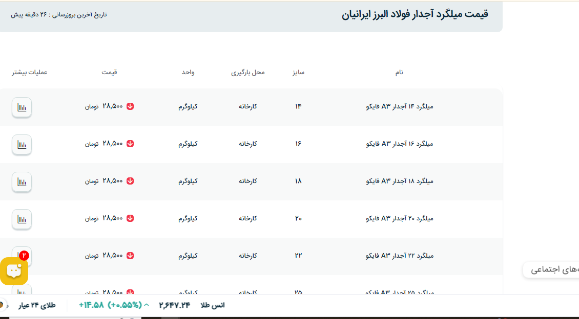 موجودی میلگرد نرمال ذوب اهن اصفهان ١۴ کارخانه٢۵٩٠٠ ١۴ انبار ٢۴٩٠٠ زرد بار ١٨ کوتاه انبار ٢٣٨٠٠انبارداری ١٣٠ظرفیت موجود ٢٨ انبار ٢۴٩٠٠موجود ١٢ تن ١٢ انبار ٢۵۴٠٠ ١٢ کارخانه ٢۵۵٠٠ میلگردهای ١۴ متری ١٢ انبار ٢٩٠٠٠ ١۶ ذنبار ٢٨۶٠٠ ٢٠انبار ٢٨٧٠٠ ٣٢ انبار ٢٩٢٠٠ ٣٢ شاخه انبار ٣٠١٠٠ ٢۵ گرید آ۴. ٣٠٢٠٠ ٢۵ آ١ ظرفیت انبار ٣١۶٠٠ ١۶ آ١ ظرفیت ذوب ٣٠۶٠٠