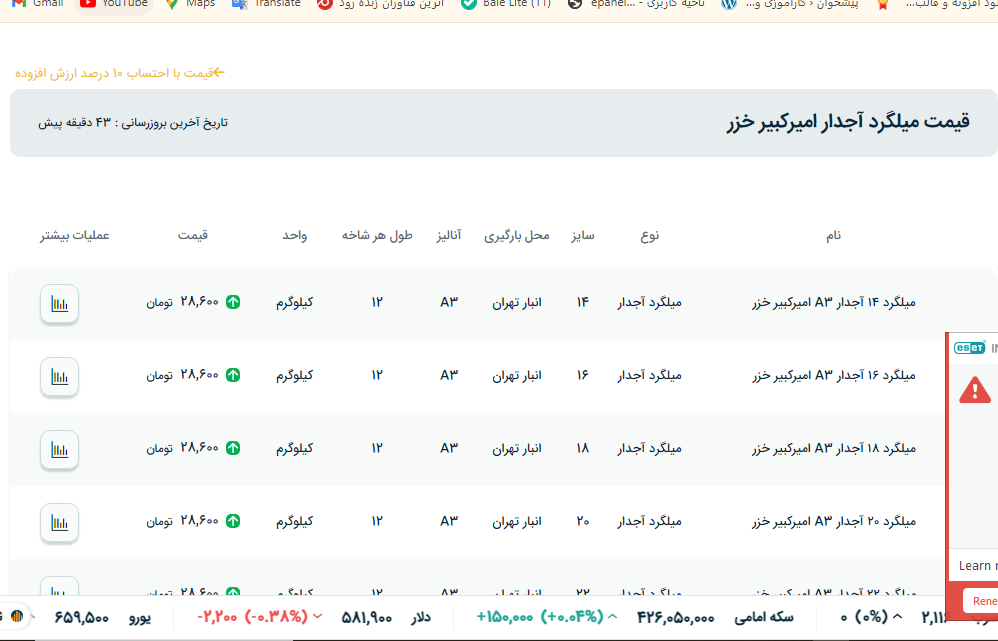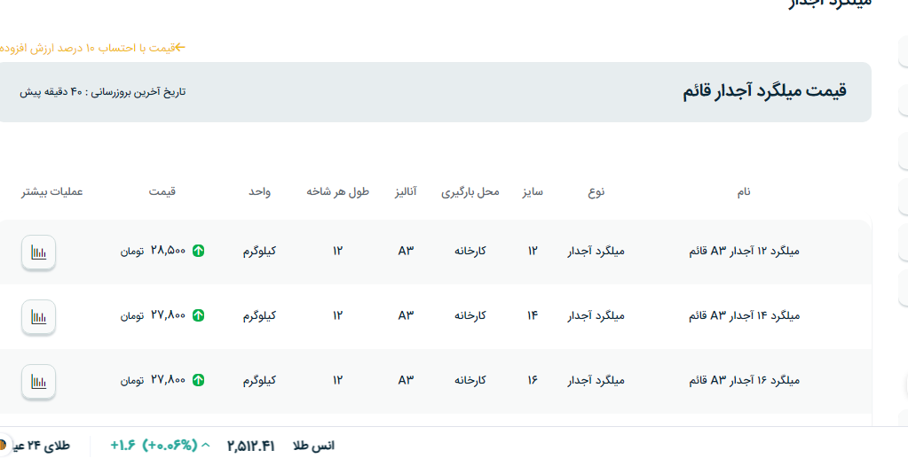 گرد۱۲ذوبی:۳۰۵،۰۰۰ ریال گرد۱۴ذوبی : ۲۹۷،۰۰۰ریال گرد۱۶ذوبی: ۲۹۶،۰۰۰ ریال گرد۱۸ذوبی : ۲۹۵،۰۰۰ریال گرد۲۰ذوبی :۲۹۶،۰۰۰ ریال گرد۲۲ذوبی: ۲۹۷،۰۰۰ ریال گرد۲۵ذوبی: ۲۹۷،۰۰۰ ریال گرد۲۸ذوبی:۲۹۷،۰۰۰ ریال گرد۳۲ذوبی:۲۹۷،۰۰۰ ریال ✅ قیمت ها با تایید میباشد