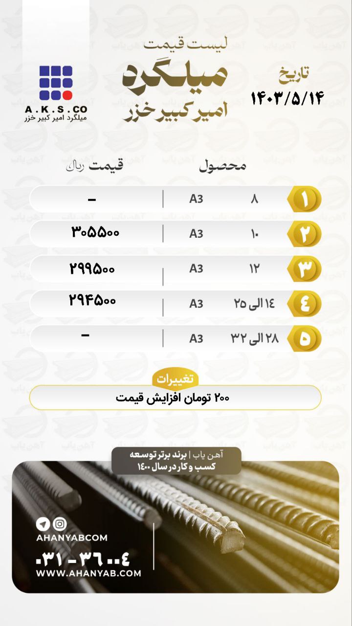 محصول قیمت قیمت (با مالیات) یکشنبه 1403/05/14 ساعت 12:28 میلگرد آجدار 8 A2 ظفر بناب 30,100 میلگرد آجدار 10 A2 ظفر بناب 29,700 میلگرد آجدار 12 A3 ظفر بناب 29,700 میلگرد آجدار 14 A3 ظفر بناب 29,300 میلگرد آجدار 16 A3 ظفر بناب 29,300 میلگرد آجدار 18 A3 ظفر بناب 29,300 میلگرد آجدار 20 A3 ظفر بناب 29,300 میلگرد آجدار 22 A3 ظفر بناب 29,300 میلگرد آجدار 25 A3 ظفر بناب 29,300 میلگرد آجدار 28 A3 ظفر بناب 29,300 میلگرد آجدار 12 A3 ذوب آهن اصفهان 31,050 میلگرد آجدار 14 A3 ذوب آهن اصفهان 30,400 میلگرد آجدار 16 A3 ذوب آهن اصفهان 30,300 میلگرد آجدار 18 A3 ذوب آهن اصفهان 29,700 میلگرد آجدار 20 A3 ذوب آهن اصفهان 29,800 میلگرد آجدار 22 A3 ذوب آهن اصفهان 29,700 میلگرد آجدار 25 A3 ذوب آهن اصفهان 29,700 میلگرد آجدار 28 A3 ذوب آهن اصفهان 29,700 میلگرد آجدار 14 A3 نیشابور بنگاه تهران 29,700 میلگرد آجدار 16 A3 نیشابور بنگاه تهران 29,700 میلگرد آجدار 18 A3 نیشابور بنگاه تهران 29,700 میلگرد آجدار 20 A3 نیشابور بنگاه تهران 29,700 میلگرد آجدار 22 A3 نیشابور بنگاه تهران 29,700 میلگرد آجدار 25 A3 نیشابور بنگاه تهران 29,700 میلگرد آجدار 28 A3 نیشابور بنگاه تهران 29,700 میلگرد آجدار 14 A3 نیشابور کارخانه 29,300 میلگرد آجدار 16 A3 نیشابور کارخانه 29,300 میلگرد آجدار 18 A3 نیشابور کارخانه 29,300 میلگرد آجدار 20 A3 نیشابور کارخانه 29,300 میلگرد آجدار 22 A3 نیشابور کارخانه 29,300 میلگرد آجدار 25 A3 نیشابور کارخانه 29,300 میلگرد آجدار 28 A3 نیشابور کارخانه 29,300 میلگرد آجدار 14 A3 فولاد پارس سیستان 29,100 میلگرد آجدار 16 A3 فولاد پارس سیستان 29,100 میلگرد آجدار 18 A3 فولاد پارس سیستان 29,100 میلگرد آجدار 10 A2 خرمدشت 29,400 میلگرد آجدار 12 A2 خرمدشت 29,400 ☎️ شماره تماس: شماره چهار رقمی تهران 1849 شهرستانها 02186020094 instagram.com/digi.ahan :اینستاگرام🆔 🌐وبسایت: www.digiahan.com ✅تلگرام: https://t.me/Digiahan1849