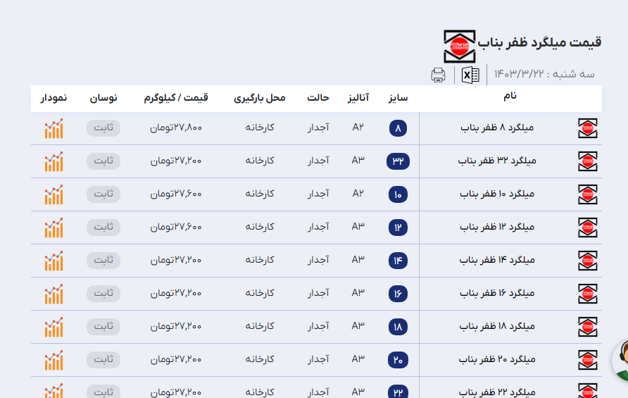 محصول قیمت قیمت (با مالیات) سه شنبه 1403/03/22 ساعت 12:45 میلگرد آجدار 8 A2 ظفر بناب 27,900 میلگرد آجدار 10 A2 ظفر بناب 27,700 میلگرد آجدار 12 A3 ظفر بناب 27,700 میلگرد آجدار 14 A3 ظفر بناب 27,300 میلگرد آجدار 16 A3 ظفر بناب 27,300 میلگرد آجدار 18 A3 ظفر بناب 27,300 میلگرد آجدار 20 A3 ظفر بناب 27,300 میلگرد آجدار 22 A3 ظفر بناب 27,300 میلگرد آجدار 25 A3 ظفر بناب 27,300 میلگرد آجدار 28 A3 ظفر بناب 27,300 میلگرد آجدار 12 A3 ذوب آهن اصفهان 29,300 میلگرد آجدار 14 A3 ذوب آهن اصفهان 27,300 میلگرد آجدار 16 A3 ذوب آهن اصفهان 27,300 میلگرد آجدار 18 A3 ذوب آهن اصفهان 26,900 میلگرد آجدار 20 A3 ذوب آهن اصفهان 26,900 میلگرد آجدار 22 A3 ذوب آهن اصفهان 26,900 میلگرد آجدار 25 A3 ذوب آهن اصفهان 27,300 میلگرد آجدار 28 A3 ذوب آهن اصفهان 26,900 میلگرد آجدار 14 A3 نیشابور بنگاه تهران 27,400 میلگرد آجدار 16 A3 نیشابور بنگاه تهران 27,400 میلگرد آجدار 18 A3 نیشابور بنگاه تهران 27,400 میلگرد آجدار 20 A3 نیشابور بنگاه تهران 27,400 میلگرد آجدار 22 A3 نیشابور بنگاه تهران 27,400 میلگرد آجدار 25 A3 نیشابور بنگاه تهران 27,400 میلگرد آجدار 28 A3 نیشابور بنگاه تهران 27,400 میلگرد آجدار 14 A3 نیشابور کارخانه 26,600 میلگرد آجدار 16 A3 نیشابور کارخانه 26,600 میلگرد آجدار 18 A3 نیشابور کارخانه 26,600 میلگرد آجدار 20 A3 نیشابور کارخانه 26,600 میلگرد آجدار 22 A3 نیشابور کارخانه 26,600 میلگرد آجدار 25 A3 نیشابور کارخانه 26,600 میلگرد آجدار 28 A3 نیشابور کارخانه 26,600 میلگرد آجدار 14 A3 فولاد پارس سیستان 27,000 میلگرد آجدار 16 A3 فولاد پارس سیستان 27,000 میلگرد آجدار 18 A3 فولاد پارس سیستان 27,000 میلگرد آجدار 10 A2 خرمدشت 26,300 میلگرد آجدار 12 A2 خرمدشت 26,300 ☎️ شماره تماس: شماره چهار رقمی تهران 1849 شهرستانها 02186020094 instagram.com/digi.ahan :اینستاگرام🆔 🌐وبسایت: www.digiahan.com ✅تلگرام: https://t.me/Digiahan1849