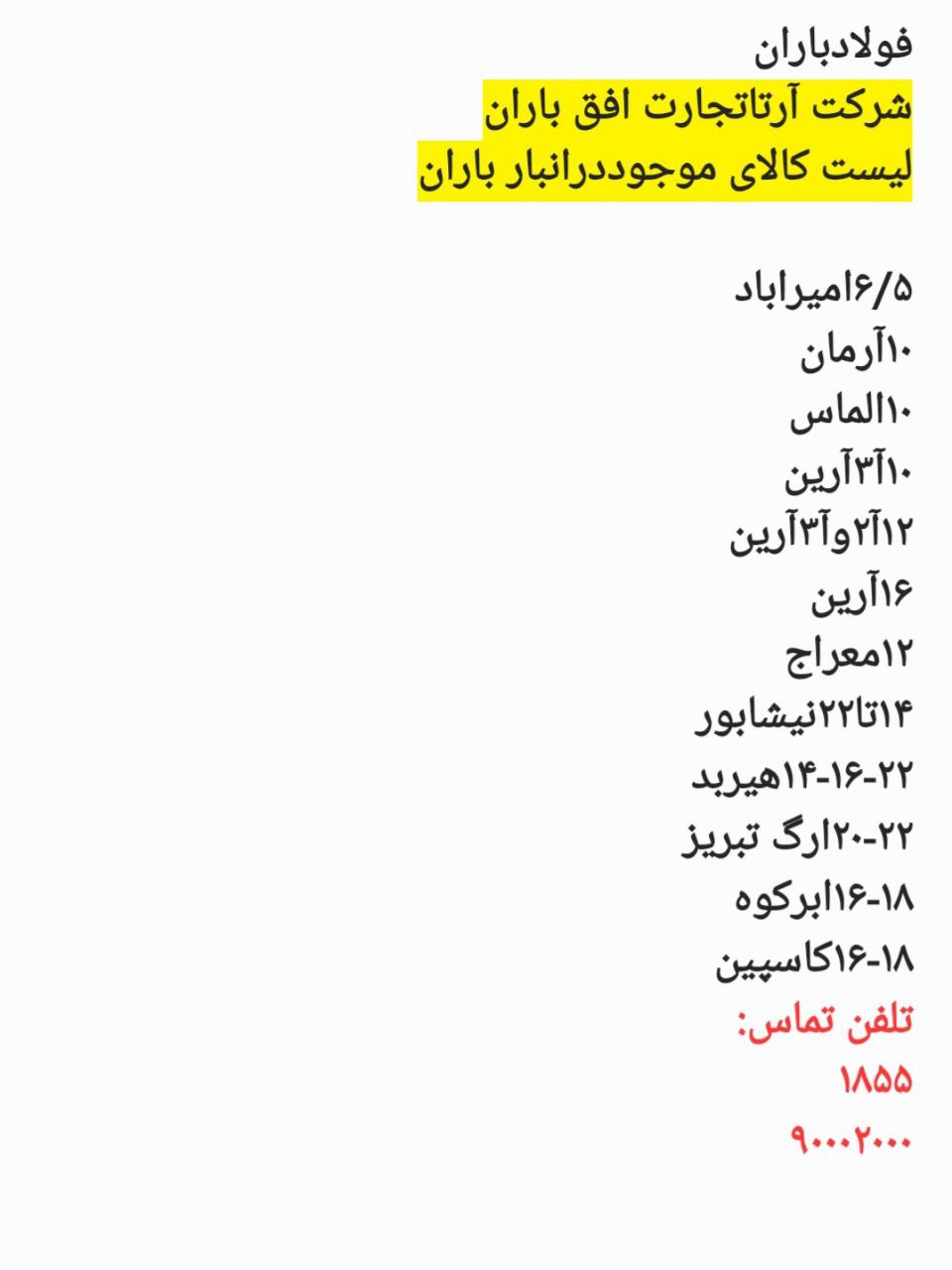 💠 موجودی میلگرد آجدار ✅ میلگرد ۶/۵ بندیلی ۲۹۸،۰۰۰ ﷼ ✅ میلگرد ۶/۵ باز ۳۰۳،۰۰۰ ﷼ ✅ میلگرد ۱۰ کلاف ۲۹۸،۰۰۰ ﷼ ✅ میلگرد ۱۰ آرین ۲۹۸،۰۰۰ ﷼ ✅ میلگرد ۱۲ آرین ۲۹۱،۰۰۰ ﷼ ✅ میلگرد ۱۰ A3 آرین ۲۹۸،۰۰۰ ﷼ ✅ میلگرد ۱۲ A3 آرین ۲۹۴،۰۰۰ ﷼ ✅ میلگرد ۱۰ ابهر ۲۹۱،۰۰۰ ﷼ ✅ میلگرد ۱۴ پرشین ۲۸۴،۰۰۰ ﷼ ✅ میلگرد ۱۶ پرشین ۲۸۴،۰۰۰ ﷼ ✅ میلگرد ۱۸ پرشین ۲۸۴،۰۰۰ ﷼ ✅ میلگرد ۲۰ پرشین ۲۸۴،۰۰۰ ﷼ ✅ میلگرد ۲۲ پرشین ۲۸۴،۰۰۰ ﷼ ✅ میلگرد ۲۵ پرشین ۲۸۴،۰۰۰ ﷼ ✅ میلگرد ۱۴ نیشابور ۲۸۹،۰۰۰ ﷼ ✅ میلگرد ۱۶ نیشابور ۲۸۹،۰۰۰ ﷼ ✅ میلگرد ۱۸ نیشابور ۲۸۹،۰۰۰ ﷼ ✅ میلگرد ۲۰ نیشابور ۲۸۹،۰۰۰ ﷼ ✅ میلگرد ۲۲ نیشابور ۲۸۹،۰۰۰ ﷼ ✅ میلگرد ۲۵ نیشابور ۲۸۹،۰۰۰ ﷼ ✅ میلگرد ۲۸ نیشابور ۲۸۹،۰۰۰ ﷼ ✅ میلگرد ۱۴ پردیس ۲۸۴،۰۰۰ ﷼ ✅ میلگرد ۱۶ پردیس ۲۸۴،۰۰۰ ﷼ ✅ میلگرد ۱۸ پردیس ۲۸۴،۰۰۰ ﷼ ✅ میلگرد ۲۰ پردیس ۲۸۴،۰۰۰ ﷼ ✅ میلگرد ۲۲ پردیس ۲۸۴،۰۰۰ ﷼ ✅ میلگرد ۲۵ پردیس ۲۸۴،۰۰۰ ﷼ ✅ میلگرد ۱۲ هیربد ۲۹۶،۰۰۰ ﷼ ✅ میلگرد ۱۴ هیربد ۲۸۵،۰۰۰ ﷼ ✅ میلگرد ۱۶ هیربد ۲۸۵،۰۰۰ ﷼ ✅ میلگرد ۱۸ هیربد ۲۸۵،۰۰۰ ﷼ ✅ میلگرد ۲۰ هیربد ۲۸۵،۰۰۰ ﷼ ✅ میلگرد ۲۲ هیربد ۲۸۵،۰۰۰ ﷼ ✅ میلگرد ۲۵ هیربد ۲۸۵،۰۰۰ ﷼ ✅ میلگرد ۲۸ هیربد ۲۸۵،۰۰۰ ﷼ 🔸رسمی و 🔸تمامی اقلام به شرط سلامت 🔸تسویه نقدی و توافقی ☎️ ۰۲۱-۵۵۵۳۴۲۲۹ 📱 ۰۹۱۲۰۲۳۷۱۲۲