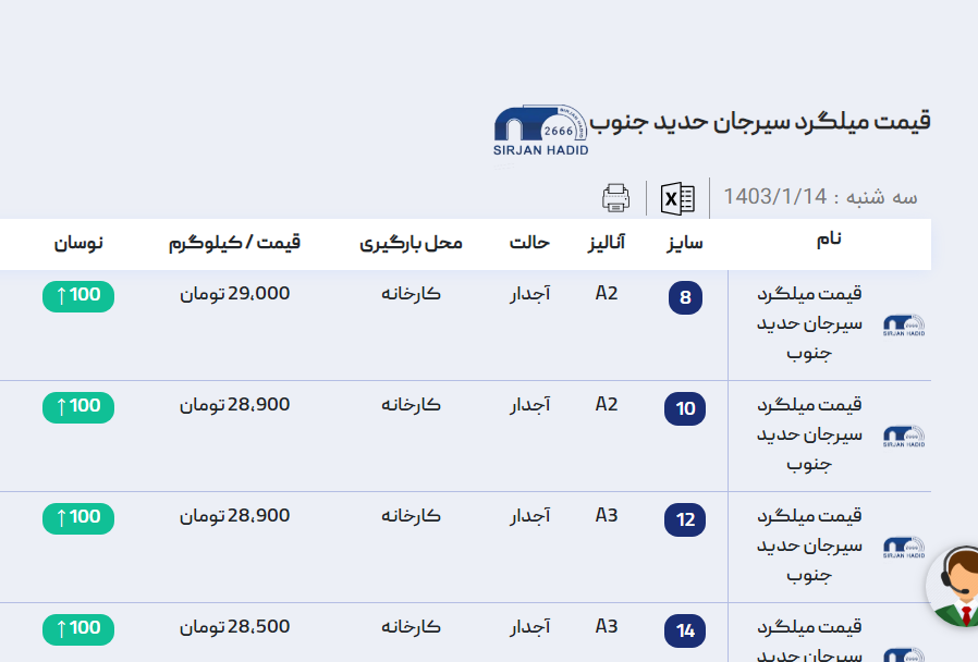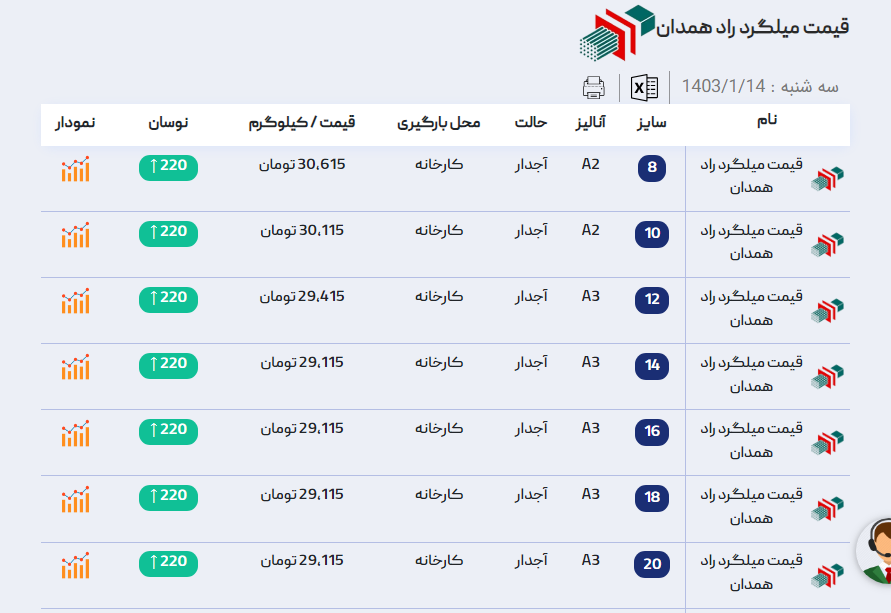 💢میلگرد راد همدان ◻️ثابت 14 الی 22 ⬅️ 29.115 تومان 💢میلگرد سیرجان حدید جنوب ◽️ ثابت 14 الی 25 ⬅️28.500 تومان 💢میلگرد آناهیتا گیلان ◽️ ثابت 14 الی 22 ⬅️ 29.000 تومان 💢میلگرد سلفچگان ◻️ثابت 14 الی 25 ⬅️ 28.000 تومان
