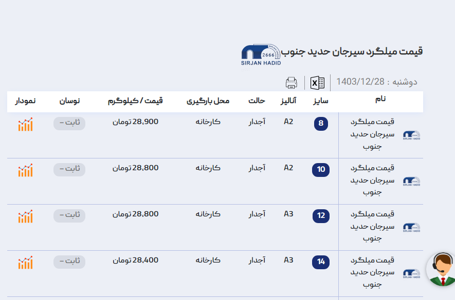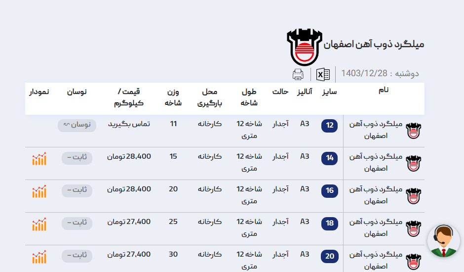 فولاد راد همدان: ۱۴۰۳/۰۱/۱۴ گرد ۸ : ۳۰۶۱۵۰ ◽️ گرد ۱۰ : ۳۰۱۱۵۰ ◽️ گرد ۱۲ : ۲۹۴۱۵۰ ◽️ گرد ۱۴الی۲۲ : ۲۹۱۱۵۰ ◽️ گرد ۲۵و۲۸ : ۲۹۱۶۵۰ ◽️ کلاف ۶.۵: ۳۰۳۱۵۰ ◽️ کلاف ۸: ۲۹۴۱۵۰ ◽️ t.me/a_attarian