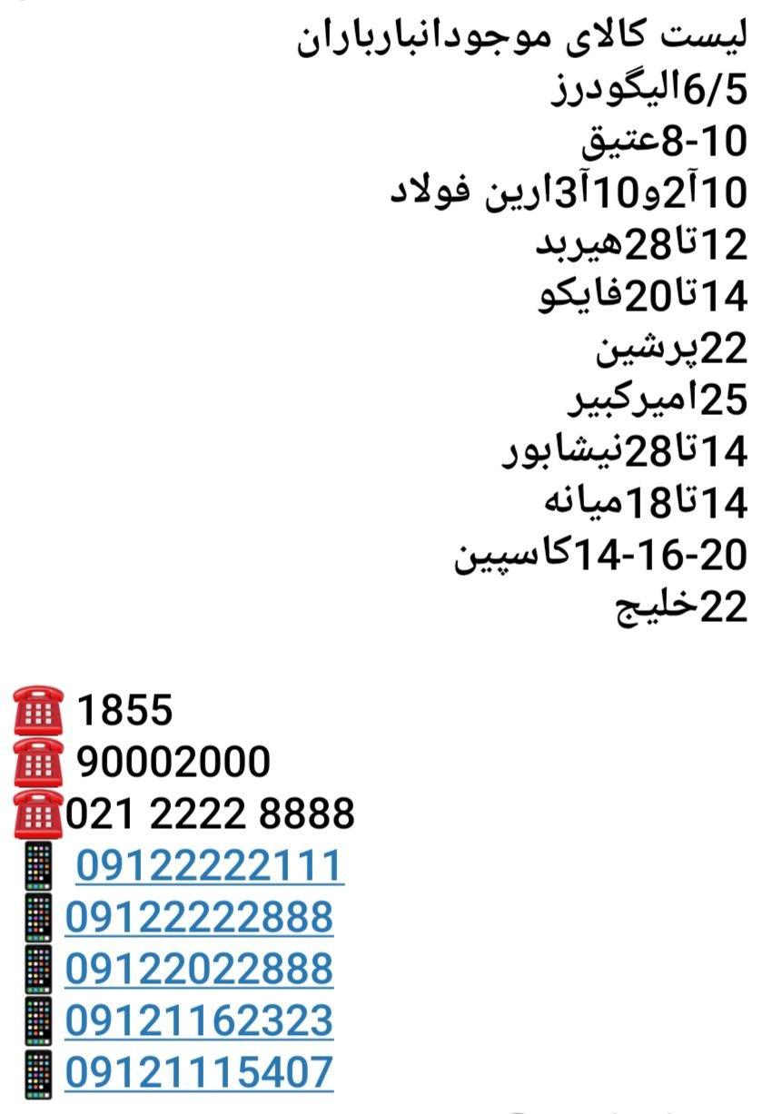 ♦️توسعه آهن شایسته♦️ 📍شادآباد مجتمع بوستان باسکول بوستان لیست انبار🗒 ۶/۵کلاف (امیرآباد) گرد.۸._بنابA2➖ گرد.۱۰._بنابA2➖ گرد.۱۰._ابهرA2➖ گرد.۱۲._ابهرA2➖ گرد.۱۰._آریانA2➖ گرد.۱۲._هیربدA3➖ گرد.۱۴._هیربدA3➖ گرد.۱۶._هیربدA3➖ گرد.۱۸._هیربدA3➖ گرد.۲۰._هیربدA3➖ گرد.۲۲._هیربدA3➖ گرد.۲۵._هیربدA3➖ گرد.۱۴._پرشینA3➖ گرد.۲۲._پرشینA3➖ گرد.۲۵._پرشینA3➖ گرد.۱۴._ابرکوهA3➖ گرد.۱۴._سیرجانA3➖ گرد.۲۰._اروندA3➖ گرد.۲۰._خلیجA3➖ قیمت مناسب تماس بگیرید📞 🔹تمامی اجناس در ۱ انبار میباشد🔹 در صورت نیاز فاکتور رسمی صادر میگردد ☎️اخوان آرزومند ۰۲۱_۶۶۱۳۸۰۰۱ ۰۲۱_۶۶۱۳۸۰۰۲ ۰۲۱_۶۶۱۳۸۰۰۳ ۰۲۱_۶۶۱۳۸۰۰۴ ۰۲۱_۶۶۱۳۸۰۰۵ ۰۲۱_۶۶۱۳۸۰۰۶