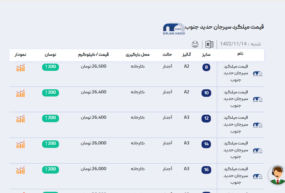 محصول قیمت (با مالیات) شنبه 1402/11/14 ساعت 14:50 میلگرد آجدار 8 A2 ظفر بناب 26,200 میلگرد آجدار 10 A2 ظفر بناب 26,200 میلگرد آجدار 12 A3 ظفر بناب 25,800 میلگرد آجدار 14 A3 ظفر بناب 25,800 میلگرد آجدار 16 A3 ظفر بناب 25,800 میلگرد آجدار 18 A3 ظفر بناب 25,800 میلگرد آجدار 20 A3 ظفر بناب 25,800 میلگرد آجدار 22 A3 ظفر بناب 25,800 میلگرد آجدار 25 A3 ظفر بناب 25,800 میلگرد آجدار 28 A3 ظفر بناب 25,800 میلگرد آجدار 12 A3 ذوب آهن اصفهان 26,600 میلگرد آجدار 14 A3 ذوب آهن اصفهان 25,800 میلگرد آجدار 16 A3 ذوب آهن اصفهان 25,800 میلگرد آجدار 18 A3 ذوب آهن اصفهان 25,200 میلگرد آجدار 20 A3 ذوب آهن اصفهان 25,200 میلگرد آجدار 22 A3 ذوب آهن اصفهان 25,000 میلگرد آجدار 25 A3 ذوب آهن اصفهان 25,400 میلگرد آجدار 28 A3 ذوب آهن اصفهان 25,400 میلگرد آجدار 14 A3 نیشابور بنگاه تهران 25,000 میلگرد آجدار 16 A3 نیشابور بنگاه تهران 25,000 میلگرد آجدار 18 A3 نیشابور بنگاه تهران 25,000 میلگرد آجدار 20 A3 نیشابور بنگاه تهران 25,000 میلگرد آجدار 22 A3 نیشابور بنگاه تهران 25,000 میلگرد آجدار 25 A3 نیشابور بنگاه تهران 25,000 میلگرد آجدار 28 A3 نیشابور بنگاه تهران 25,000 میلگرد آجدار 14 A3 نیشابور کارخانه 24,200 میلگرد آجدار 16 A3 نیشابور کارخانه 24,200 میلگرد آجدار 18 A3 نیشابور کارخانه 24,200 میلگرد آجدار 20 A3 نیشابور کارخانه 24,200 میلگرد آجدار 22 A3 نیشابور کارخانه 24,200 میلگرد آجدار 25 A3 نیشابور کارخانه 24,200 میلگرد آجدار 28 A3 نیشابور کارخانه 24,200 میلگرد آجدار 14 A3 فولاد پارس سیستان 25,800 میلگرد آجدار 16 A3 فولاد پارس سیستان 25,800 میلگرد آجدار 18 A3 فولاد پارس سیستان 25,800 میلگرد آجدار 10 A2 خرمدشت 25,200 میلگرد آجدار 10 A3 خرمدشت 25,200 میلگرد آجدار 12 A2 خرمدشت 25,200 میلگرد آجدار 12 A3 خرمدشت 25,200 📡 راه های ارتباطی در دیجی اهن: ☎️ شماره تماس: شماره چهار رقمی تهران 1849 شهرستانها 02186020094 instagram.com/digi.ahan :اینستاگرام🆔 🌐وبسایت: www.digiahan.com ✅تلگرام: https://t.me/Digiahan1849