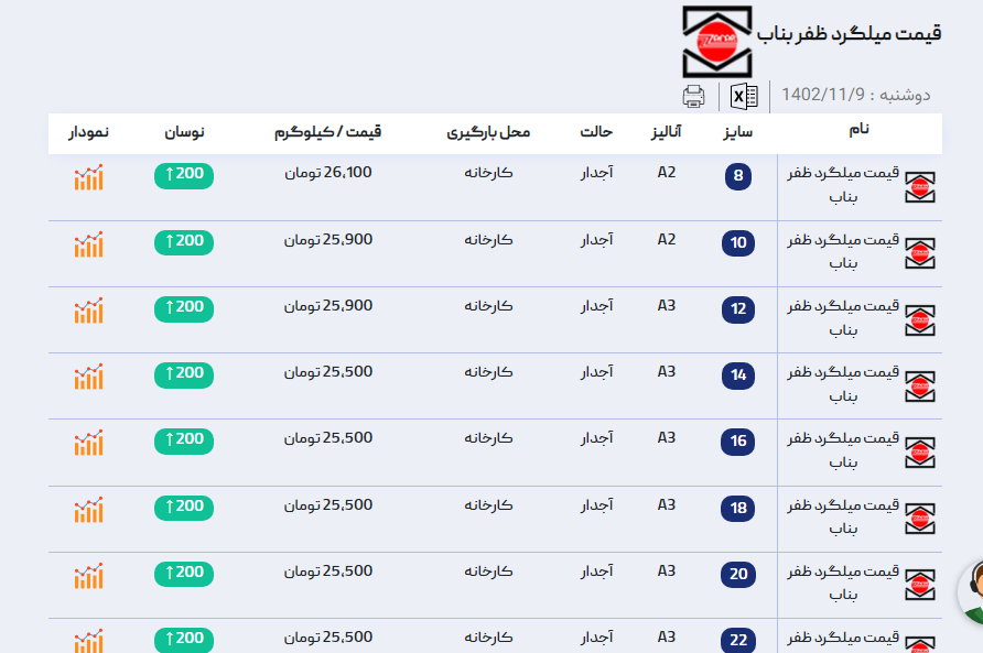 اعلام موجودی میلگرد آهن یاب لیست کالای فولاد سیادن ابهر : 📅 یکشنبه : ۱۴۰۲/۱۱/۸ (افزایش قیمت) ♦️ میلگرد ۱۰ A2 💵24650 تومان 📈 200 ♦️ میلگرد ۱۲ A2 💵24650 تومان 📈 200 ♦️ میلگرد ۱۴ A3 💵24450 تومان 📈 300 ♦️ میلگرد ۱۶ A3 💵24450 تومان 📈 300 ♦️ میلگرد ۱۸ A3 💵24450 تومان 📈 300 ♦️ میلگرد ۲۰ A3 💵24450 تومان 📈 300 ♦️ میلگرد ۲۲ A3 💵24450 تومان 📈 300 ♦️ میلگرد ۲۵ A3 💵24450 تومان 📈 300 ♦️ میلگرد ۸ A2 💵25650 تومان 📈 200