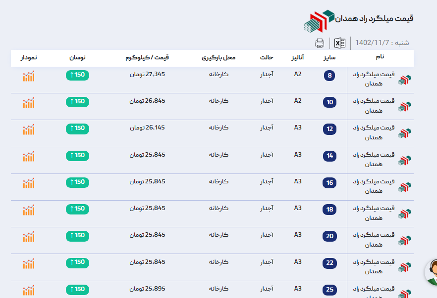 ▪️🌼🌼به نام خدا🌼🌼▪️ 1402/11/07 📊گرد6/5 بندیل 26000 📊گرد6/5 باز 26500 📊گرد8سمنان آ۳ 24500 📊گرد8ابهر 25900 📊گرد8 کلاف 28500 📊گرد10 کلاف 28500 📊گرد10ابهر عتیق 24400 📊گرد10ابهرسیادن 24200 📊گرد10 ارین 25000 📊گرد12 ابهر 24400 📊گرد18پرشین 24500 📊گرد20پرشین 24500 📊گرد22پرشین 24500 📊گرد25پرشین 24500 📊گرد14کاسپین 24200 📊گرد16کاسپین 24200 📊گرد18کاسپین 24200 📊گرد20کاسپین 24200 📊گرد14اصفهان 25000 📊گرد16اصفهان 25000 📊گرد18اصفهان 25000 📊گرد25اصفهان 25000 📊گرد14نیشابور 24900 📊گرد16نیشابور 24900 📊گرد18نیشابور 24900 📊گرد20نیشابور 24900 📊گرد22نیشابور 24900 📊گرد25نیشابور 24900 📊گرد12میانه 24900 📊گرد18میانه 24500 📊گرد25میانه 24500 📊گرد32میانه 24900 📊گرد10پردیس 25200 📊گرد12پردیس 24700 📊گرد14پردیس 24350 📊گرد16پردیس 24350 📊گرد18پردیس 24350 📊گرد20پردیس 24350 📊گرد22پردیس 24350 📊گرد25پردیس 24350 📊گرد28پردیس 24700 📊گرد32پردیس 24700 📊گرد12هیربد 24900 📊گرد14هیربد 24600 📊گرد16هیربد 24600 📊گرد18هیربد 24600 📊گرد20هیربد 24600 📊گرد22هیربد 24600 📊گرد25هیربد 24600 کلیه اجناس درب مغازه شادآباد میباشد 📁در صورت درخواست مشتری کلیه کالاها با فاکتور رسمی ارائه میگردد آدرس:تهران،بازارآهن شادآباد،مجتمع بهاران۲،بلوک ۳۳،پلاک ۱۰۰ تلفن: 66317671 لینک کانال:@milgrd_ghaffarii