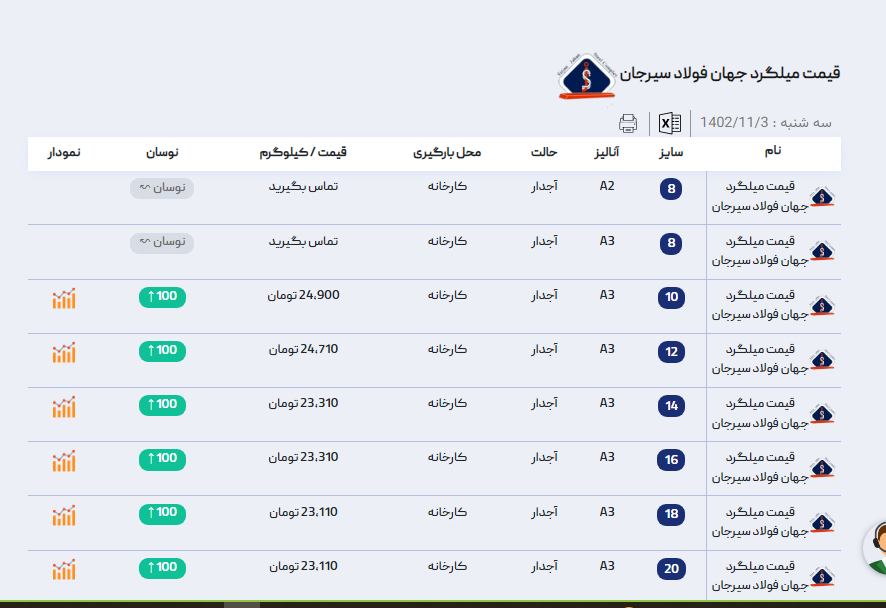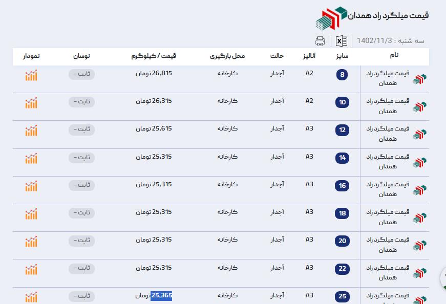 ♦️♦️به نام خدا♦️♦️ ۱۴۰۲/۱۱/۳ 🔸تهران آریا ♦️۱۰اجدار=📞 خرمدشت ♦️۱۰اجدار=📞 ♦️۱۲اجدار=📞 نیشابور ♦️۱۴ آجدار=📞 ♦️۱۶ آجدار=📞 ♦️۱۸ آجدار=📞 ♦️۲۰ آجدار=📞 ♦️۲۲ آجدار=📞 ♦️۲۵ آجدار=📞 میانه ♦️۱۴اجدار=📞 ♦️۱۸ آجدار=📞 ♦️۲۲اجدار=📞 ظفر بناب ♦️۱۸ آجدار=📞 ♦️۲۵ آجدار=📞 امیرکبیر ♦️۱۴ آجدار=📞 فایکو ♦️۱۶اجدار=📞 🔹در صورت درخواست، فروش با فاکتور رسمی هم پذیرفته میشود. https://t.me/fooladkhanbaba