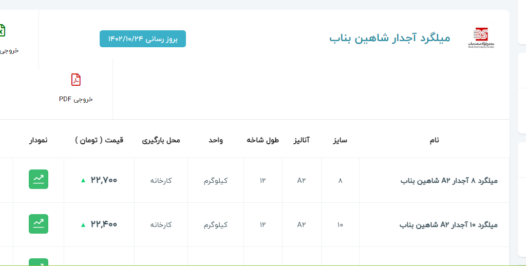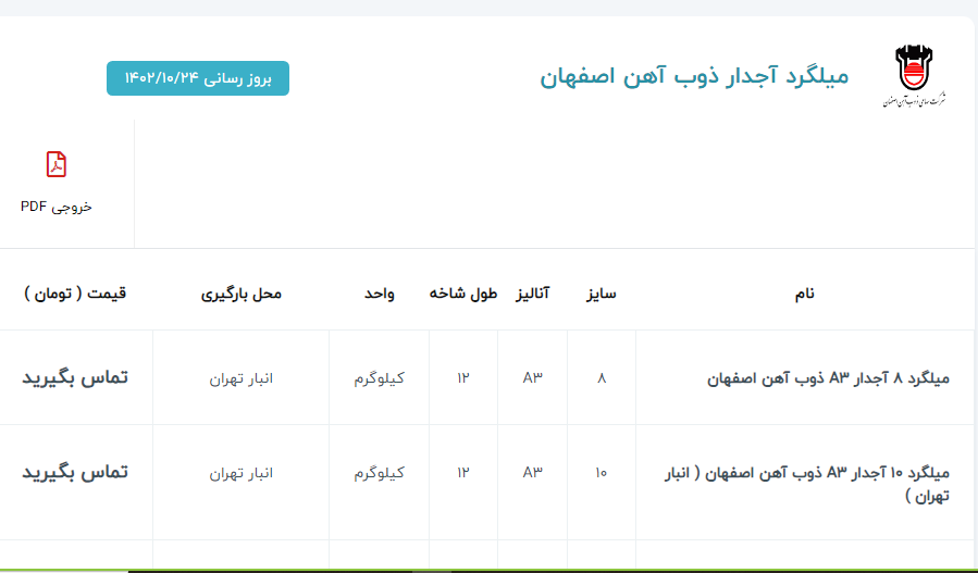 ▪️🌼🌼به نام خدا🌼🌼▪️ 1402/10/24 📊گرد6/5 بندیل 24500 📊گرد6/5 باز 25000 📊گرد8 ابهر 23900 📊گرد8 بناب 23900 📊گرد8 سپهر 24500 📊گرد8 کلاف 28000 📊گرد10 کلاف 28000 📊گرد10 ابهر 22800 📊گرد10 ارین 23500 📊گرد12 ابهر 22900 📊گرد16ابرکوه 22700 📊گرد16پرشین 22800 📊گرد18پرشین 22800 📊گرد20پرشین 22800 📊گرد14اصفهان 24500 📊گرد16اصفهان 24500 📊گرد18اصفهان 24500 📊گرد25اصفهان 24000 📊گرد14نیشابور 23900 📊گرد16نیشابور 23900 📊گرد18نیشابور 23900 📊گرد20نیشابور 23900 📊گرد22نیشابور 23900 📊گرد25نیشابور 23900 📊گرد12میانه 24200 📊گرد16میانه 23200 📊گرد18میانه 23200 📊گرد25میانه 23200 📊گرد32میانه 24100 📊گرد14کاسپین 22700 📊گرد16کاسپین 22700 📊گرد18کاسپین 22700 📊گرد20کاسپین 22700 📊گرد10پردیس 24000 📊گرد12پردیس 23500 📊گرد14پردیس 23000 📊گرد16پردیس 23000 📊گرد18پردیس 23000 📊گرد20پردیس 23000 📊گرد22پردیس 23000 📊گرد25پردیس 23000 📊گرد28پردیس 23500 📊گرد32پردیس 23500 📊گرد12هیربد 23500 📊گرد14هیربد 23100 📊گرد16هیربد 23100 📊گرد18هیربد 23100 📊گرد20هیربد 23100 📊گرد22هیربد 23100 📊گرد25هیربد 23100 📊گرد28هیربد 23500 📊گرد32هیربد 23500 کلیه اجناس درب مغازه شادآباد میباشد 📁در صورت درخواست مشتری کلیه کالاها با فاکتور رسمی ارائه میگردد آدرس:تهران،بازارآهن شادآباد،مجتمع بهاران۲،بلوک ۳۳،پلاک ۱۰۰ تلفن: 66317671 لینک کانال:@milgrd_ghaffarii
