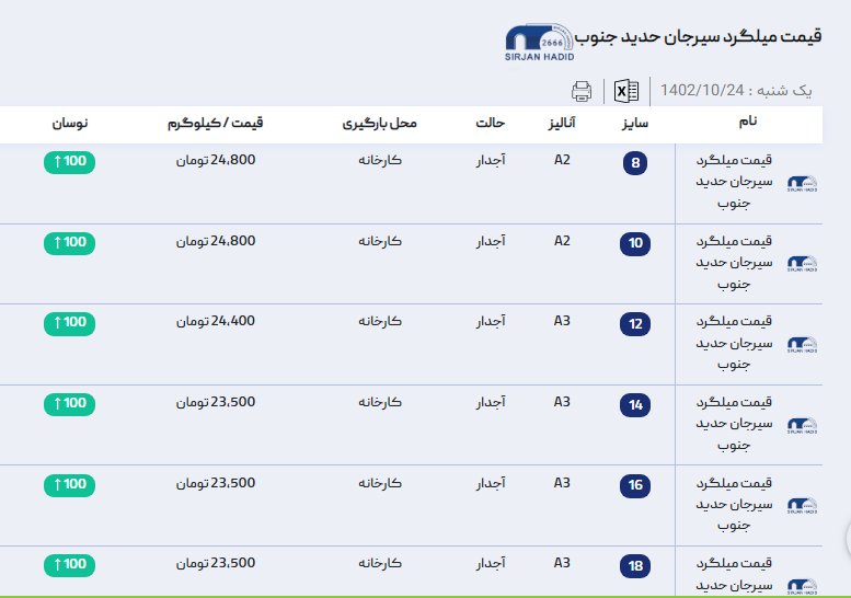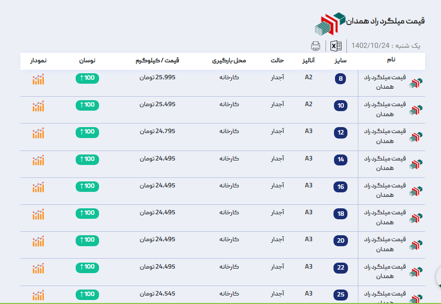 💢میلگرد راد همدان 🔺100 افزایش 14 الی 22 ⬅️ 24.495 ریال 💢 میلگرد نورد کرمان 🔺100 افزایش 12 ⬅️ 24.100 تومان 14 ⬅️ 22.900 تومان 💢میلگرد ظفر بناب 🔺100 افزایش 14 الی 32 ⬅️ 24.000 تومان 💢میلگرد سیرجان حدید جنوب 🔺100 افزایش 14 الی 20 ⬅️ 23.500 تومان