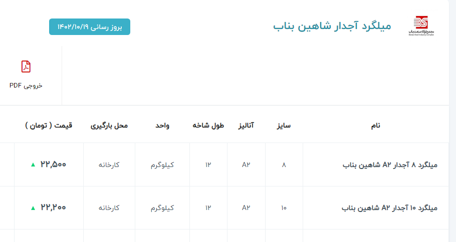 ⏱تاریخ : 19 دی 1402 🔵 قیمت میلگرد آجدار ابهر سیادن 🔵 🏭 محل بارگیری : کارخانه ▪️8 | A2 | ==> 23,550 ▪️10 | A3 | ==> 22,700 ▪️10 | A2 | ==> 22,450 ▪️12 | A3 | ==> 22,700 ▪️12 | A2 | ==> 22,450 ▪️14 | A3 | ==> 22,450 ▪️16 | A3 | ==> 22,450 ▪️18 | A3 | ==> 22,450 ▪️20 | A3 | ==> 22,450 ▪️22 | A3 | ==> 22,450 ▪️25 | A3 | ==> 22,450 ▪️28 | A3 | ==> 22,650 📞 021-91006007 🌐 www.ahanak.com 🆔https://t.me/ahanak واتساپ 🔗 https://whatsapp.com/channel/0029VaI4g5YLo4hdP2UA2O2A