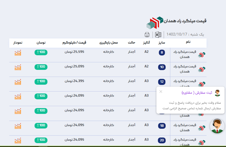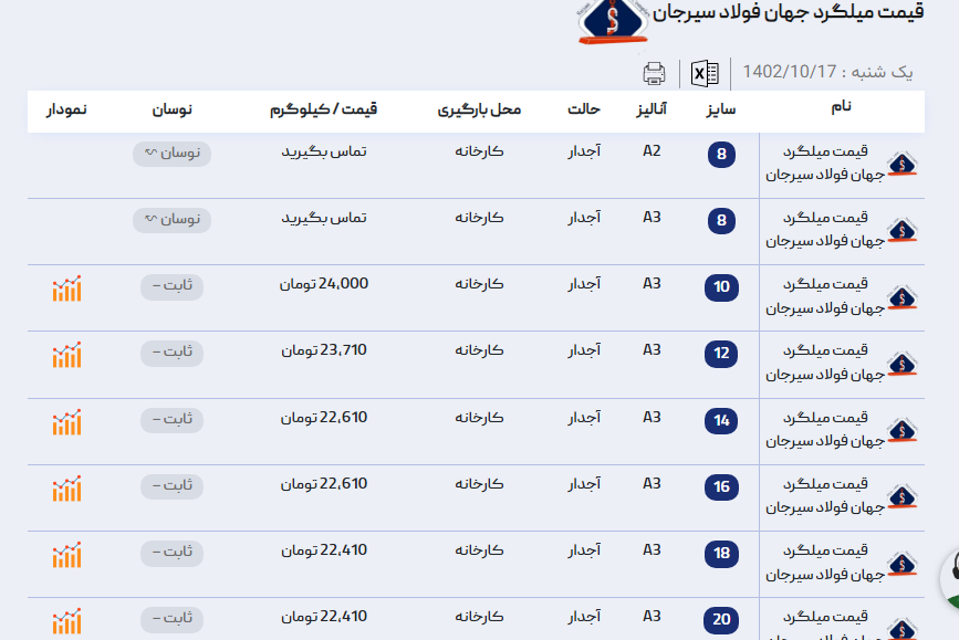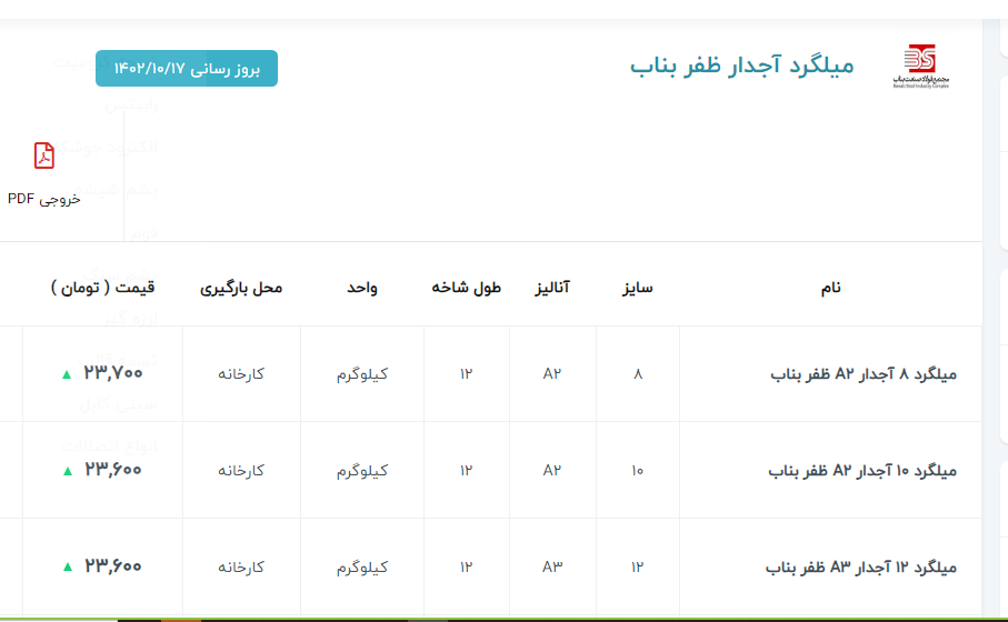 ▪️🌼🌼به نام خدا🌼🌼▪️ 1402/10/17 📊گرد6/5 بندیل 24500 📊گرد6/5 باز 25000 📊گرد8 ابهر 24200 📊گرد8 سپهر 24400 📊گرد8 کلاف 28000 📊گرد10 کلاف 28000 📊گرد10 ابهر 23000 📊گرد10 ارین 23400 📊گرد12 ابهر 23000 📊گرد12ارین آ۳ 23400 📊گرد20خلیج 22800 📊گرد25خلیج 22800 📊گرد16پرشین 22900 📊گرد14پرشین 22900 📊گرد18پرشین 22850 📊گرد20پرشین 22850 📊گرد22پرشین 22850 📊گرد14اصفهان 24500 📊گرد16اصفهان 24500 📊گرد18اصفهان 24500 📊گرد14نیشابور 23400 📊گرد16نیشابور 23400 📊گرد18نیشابور 23400 📊گرد20نیشابور 23400 📊گرد22نیشابور 23400 📊گرد25نیشابور 23400 📊گرد12میانه 23700 📊گرد14میانه ----- 📊گرد16میانه 23100 📊گرد18میانه 23100 📊گرد20میانه 23100 📊گرد22میانه 23100 📊گرد25میانه 23100 📊گرد32میانه 23900 📊گرد14ابرکوه 22900 📊گرد16ابرکوه 22900 📊گرد18ابرکوه 22900 📊گرد22ابرکوه 22900 📊گرد25ابرکوه 22900 📊گرد32ابرکوه 23300 📊گرد10پردیس 23800 📊گرد12پردیس 23400 📊گرد14پردیس 22900 📊گرد16پردیس 22900 📊گرد18پردیس 22900 📊گرد20پردیس 22900 📊گرد22پردیس 22900 📊گرد25پردیس 22900 📊گرد28پردیس 23400 📊گرد32پردیس 23400 📊گرد12هیربد 23500 📊گرد14هیربد 23000 📊گرد16هیربد 23000 📊گرد18هیربد 23000 📊گرد20هیربد 23000 📊گرد22هیربد 23000 📊گرد25هیربد 23000 📊گرد28هیربد 23300 📊گرد32هیربد 23300 کلیه اجناس درب مغازه شادآباد میباشد 📁در صورت درخواست مشتری کلیه کالاها با فاکتور رسمی ارائه میگردد آدرس:تهران،بازارآهن شادآباد،مجتمع بهاران۲،بلوک ۳۳،پلاک ۱۰۰ تلفن: 66317671 لینک کانال:@milgrd_ghaffarii