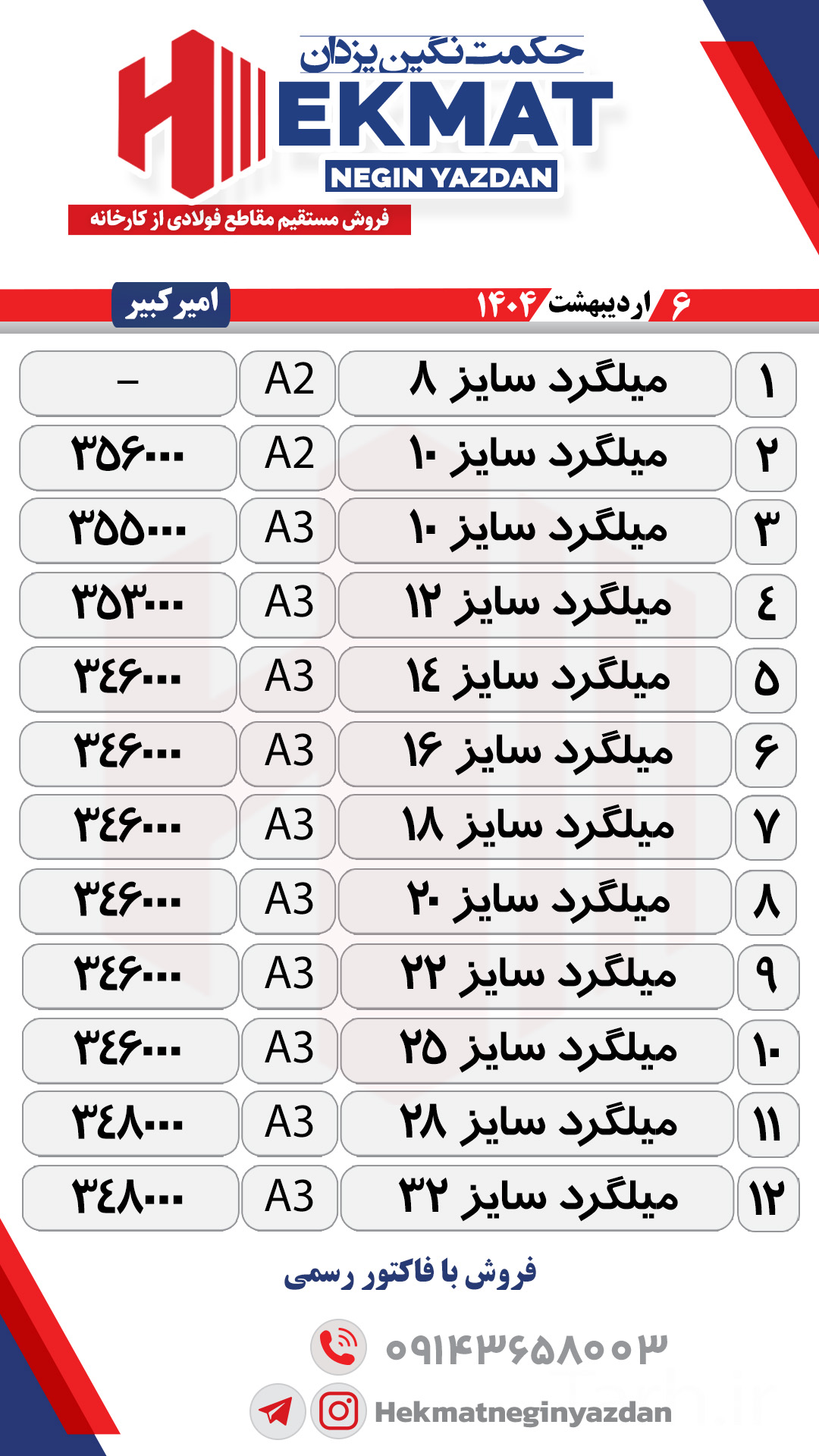 📍بارگیری از کارخانه #عتیق_آذرسهند شنبه(1404/2/6) 8 آ2 = 36100 10-12 آ2 = 35100 12 آ3 = 35600 25-16 آ3 =34500 مشاهده قیمت کانال تلگرام https://t.me/Hekmatneginyazdan بخش فروش: 📱09143658003