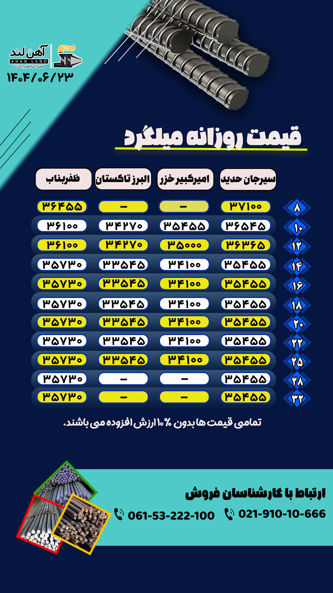 توضیحات قیمت (با مالیات) یکشنبه 1404/06/23 ساعت 15:30 تیرآهن 12 ذوب آهن 12 متری انبار تهران 7,500,000 تیرآهن 14 ذوب آهن 12 متری انبار تهران 8,700,000 تیرآهن 16 ذوب آهن 12 متری انبار تهران 9,750,000 تیرآهن 18 ذوب آهن 12 متری انبار تهران 12,600,000 تیرآهن 20 ذوب آهن 12 متری انبار تهران 17,000,000 تیرآهن 22 ذوب آهن 12 متری انبار تهران 20,180,000 تیرآهن 24 ذوب آهن 12 متری انبار تهران 23,480,000 تیرآهن 27 ذوب آهن 12 متری انبار تهران 29,900,000 تیرآهن 30 ذوب آهن 12 متری انبار تهران 35,000,000 تیرآهن 12 ذوب آهن بنگاه اصفهان 7,400,000 تیرآهن 14 ذوب آهن بنگاه اصفهان 8,700,000 تیرآهن 16 ذوب آهن بنگاه اصفهان 9,700,000 تیرآهن 18 ذوب آهن بنگاه اصفهان 12,600,000 تیرآهن 20 ذوب آهن بنگاه اصفهان 17,300,000 تیرآهن 22 ذوب آهن بنگاه اصفهان 20,180,000 تیرآهن 24 ذوب آهن بنگاه اصفهان 23,450,000 تیرآهن 27 ذوب آهن بنگاه اصفهان 30,020,000 تیرآهن 30 ذوب آهن بنگاه اصفهان 34,480,000 تیرآهن 12 ذوب آهن کارخانه 57,000 تیرآهن 14 ذوب آهن کارخانه 57,000 تیرآهن 16 ذوب آهن کارخانه 52,000 تیرآهن 18 ذوب آهن کارخانه 54,000 تیرآهن 20 ذوب آهن کارخانه 62,000 تیرآهن 22 ذوب آهن کارخانه 63,050 تیرآهن 24 ذوب آهن کارخانه 63,050 تیرآهن 27 ذوب آهن کارخانه 69,050 تیرآهن 30 ذوب آهن کارخانه 68,000 تیرآهن 14 یزد 12 متری تهران 6,150,000 تیرآهن 20 یزد 12 متری تهران 13,950,000 تیرآهن 22 یزد 12 متری تهران 17,500,000 تیرآهن 24 یزد 12 متری تهران 21,030,000 تیرآهن 14 یزد 12 متری کارخانه 44,000 تیرآهن 20 یزد 12 متری کارخانه 57,000 تیرآهن 8 وارداتی سبک 12 متری 70 کیلوگرمی 6,350,000 تیرآهن 10 وارداتی سبک 12 متری 65 کیلوگرمی 5,350,000 تیرآهن 10 وارداتی سبک 12 متری 100 کیلوگرمی 6,350,000 تیرآهن 33 وارداتی سنگین 12 متری 100,000 تیرآهن 36 وارداتی سنگین 12 متری 100,000 تیرآهن 40 وارداتی سنگین 12 متری 100,000 تیرآهن 45 وارداتی سنگین 12 متری 99,500 تیرآهن 50 وارداتی سنگین 12 متری 99,700 تیرآهن 55 وارداتی سنگین 12 متری 100,500 تیرآهن 60 وارداتی سنگین 12 متری 110,000 ☎️ شماره تماس: شماره چهار رقمی تهران 1849 شهرستانها 02186020094 instagram.com/digi.ahan :اینستاگرام🆔 🌐وبسایت: www.digiahan.com ✅تلگرام: https://t.me/Digiahan184936,5505780038,000