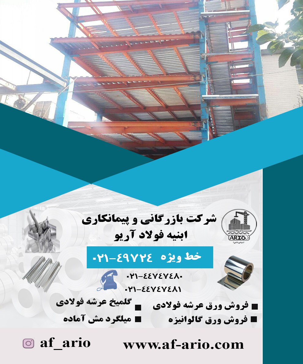 #ابنیه_فولاد_آریو ✨ تامین کننده انواع ورق گالوانیزه و رنگی (در طرحهای عرشه فولادی، شادولاین، کرکره و ...) ✨ عاملیت فروش گلمیخ فولاد آلیاژی ✨مجری تخصصی سقف عرشه فولادی ⭐️ابنیه فولاد آریو(سهامی خاص )⭐️ #جهت_مشاهده_پروفایل_ابنیه_فولاد_آریو https://foolad24.com/profile/2518 #جهت_مشاهده_اعلام_موجودی_ابنیه_فولاد_آریو https://foolad24.com/profile/2518/inventory راههای ارتباط با ما: ☎️ ۰۲۱۴۹۷۲۴ ☎️ ۰۲۱۴۴۷۴۷۴۸۰ ☎️ ۰۲۱۴۴۷۴۷۴۸۱ 📱 ۰۹۱۲۷۶۷۶۳۳۷ 🖱با یک کلیک همراهتان هستیم 📱 www.af-ario.com 📱 https://instagram.com/_u/af_ario 📱 https://t.me/af_arioco اعتباری_نیک🔤 خریدی_امن🔤 رضایتی ماندگار🔤