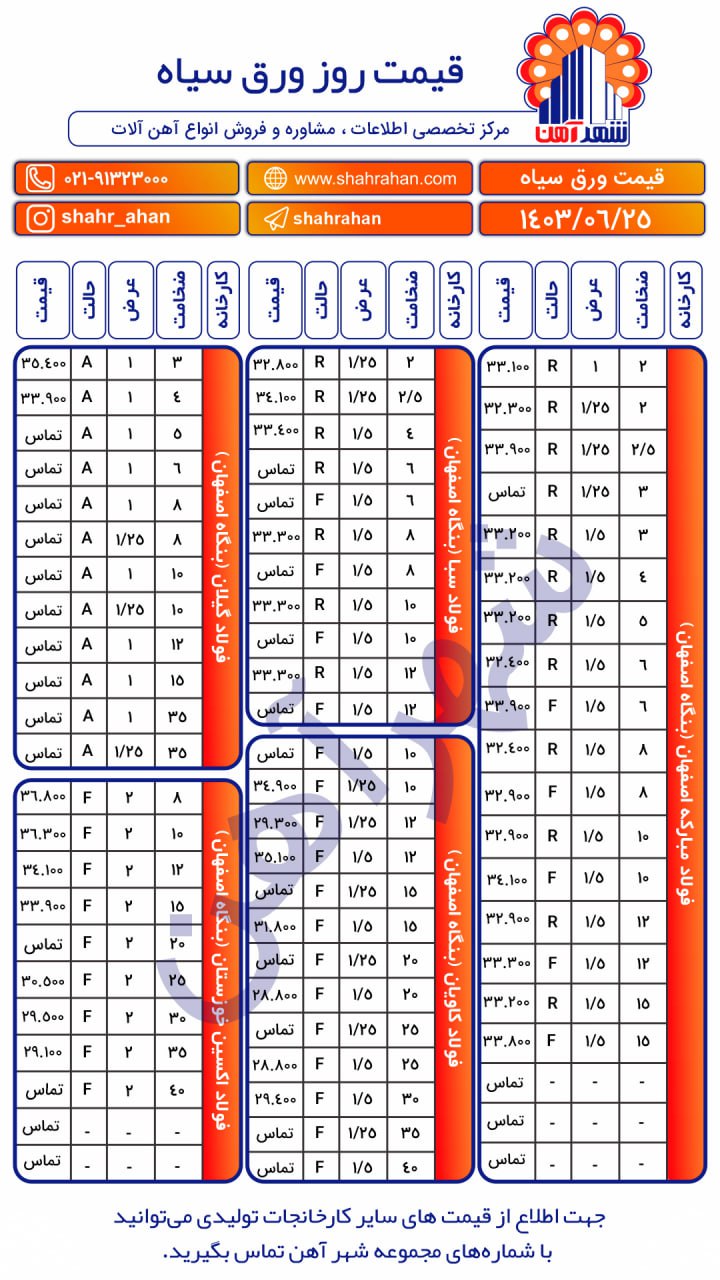 قیمت ورق سیاه 🗓 25 #شهریور 1403 #ورق #سیاه #ورق_سیاه 📞شماره تماس با مجموعه 👇 02191323000 🔸مشاهده قیمت به روز کلیه کارخانجات 👇 www.shahrahan.com 📣کانال تلگرام 👇 https://t.me/shahrahan 🌍آدرس مجموعه شهرآهن 👇 https://goo.gl/maps/JQsgAUrmvw8Bomy26